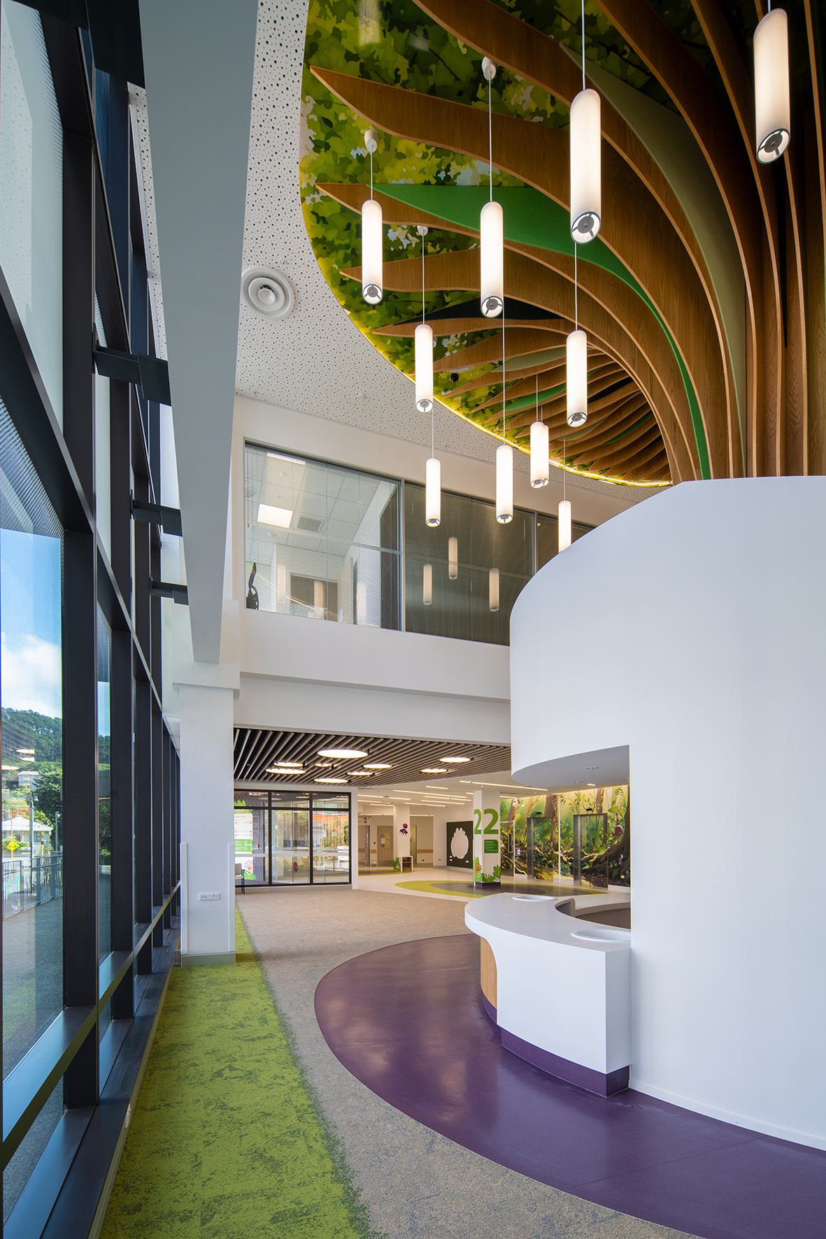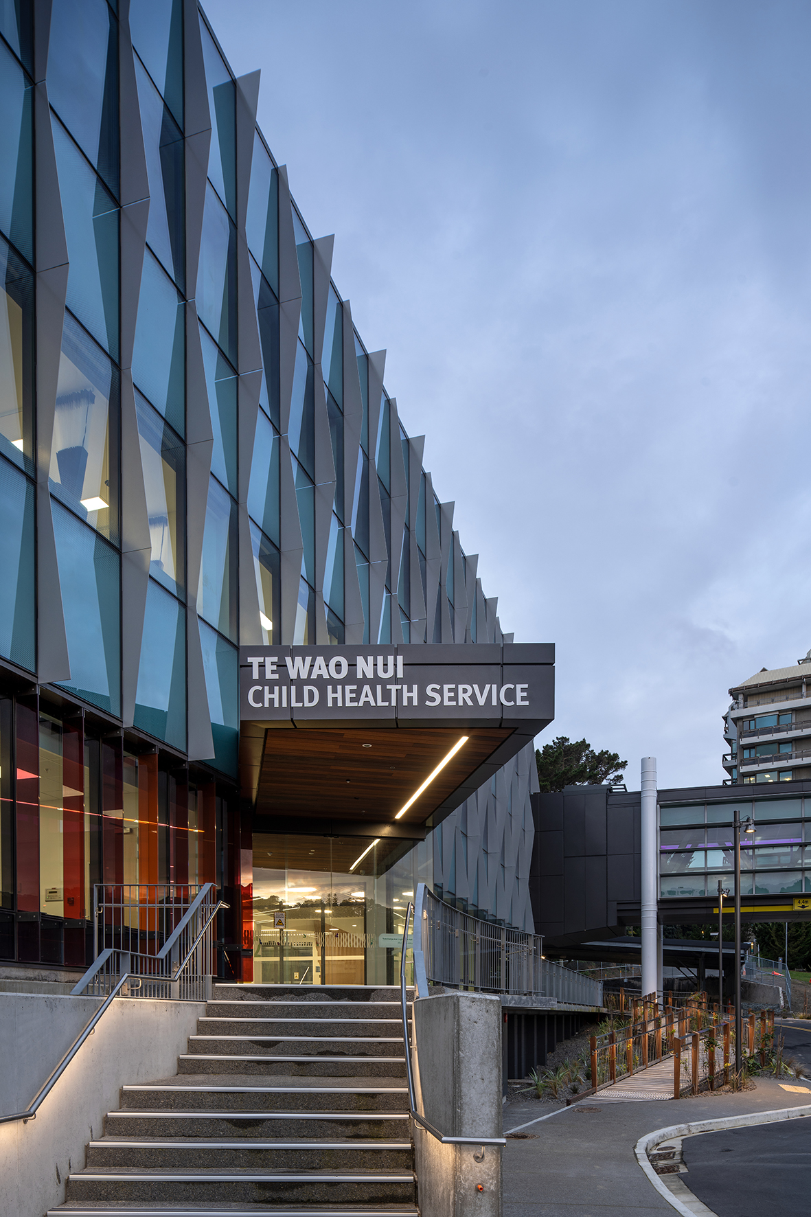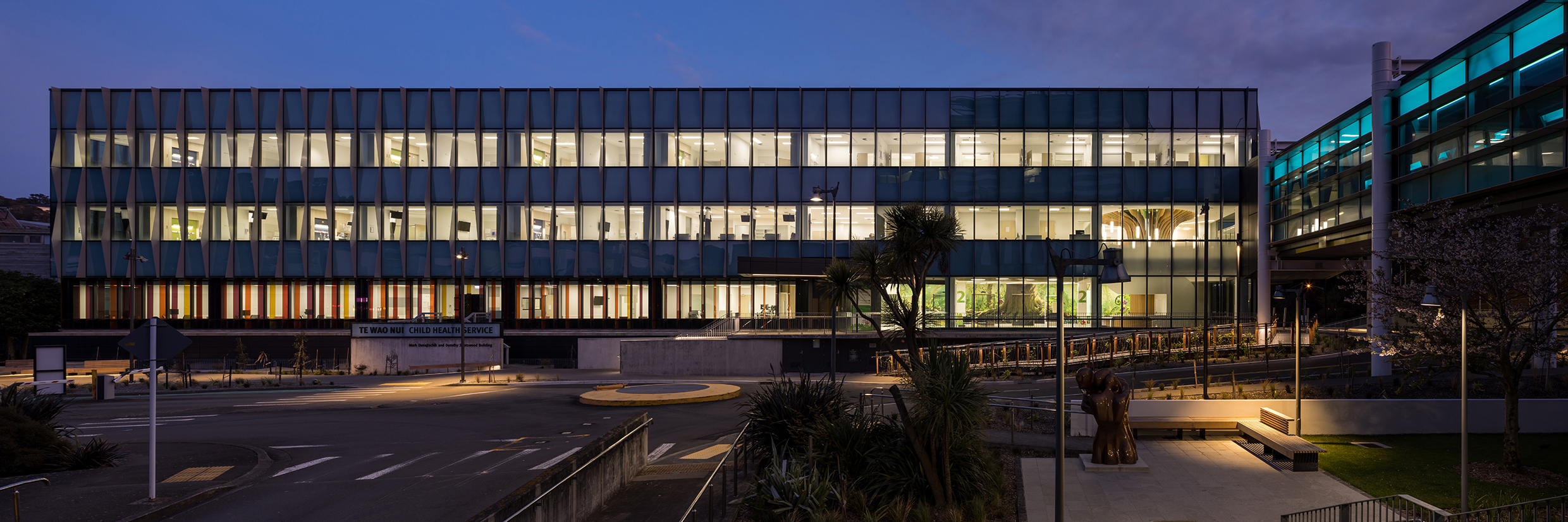 Made possible through public funding and a significant donation from philanthropist Mark Dunajtschik, Te Wao Nui is a unique healthcare facility with a welcoming, calm and child-focused environment. The building’s rigorous technical, programmatic and seismic resilience requirements have been met. Also provided are generosity of space, daylight and views throughout, while innovations from overall building services distribution, patient-room cabinetry design and whanau facilities have been creatively incorporated. Moments of discovery and playfulness have been incorporated seamlessly into the building fabric, from the warmth of interior finishes to frit patterns on glazing. Landscape and playscape areas are inviting, with extensive green foliage softening public-access areas and buffering the building from the surrounding car park.