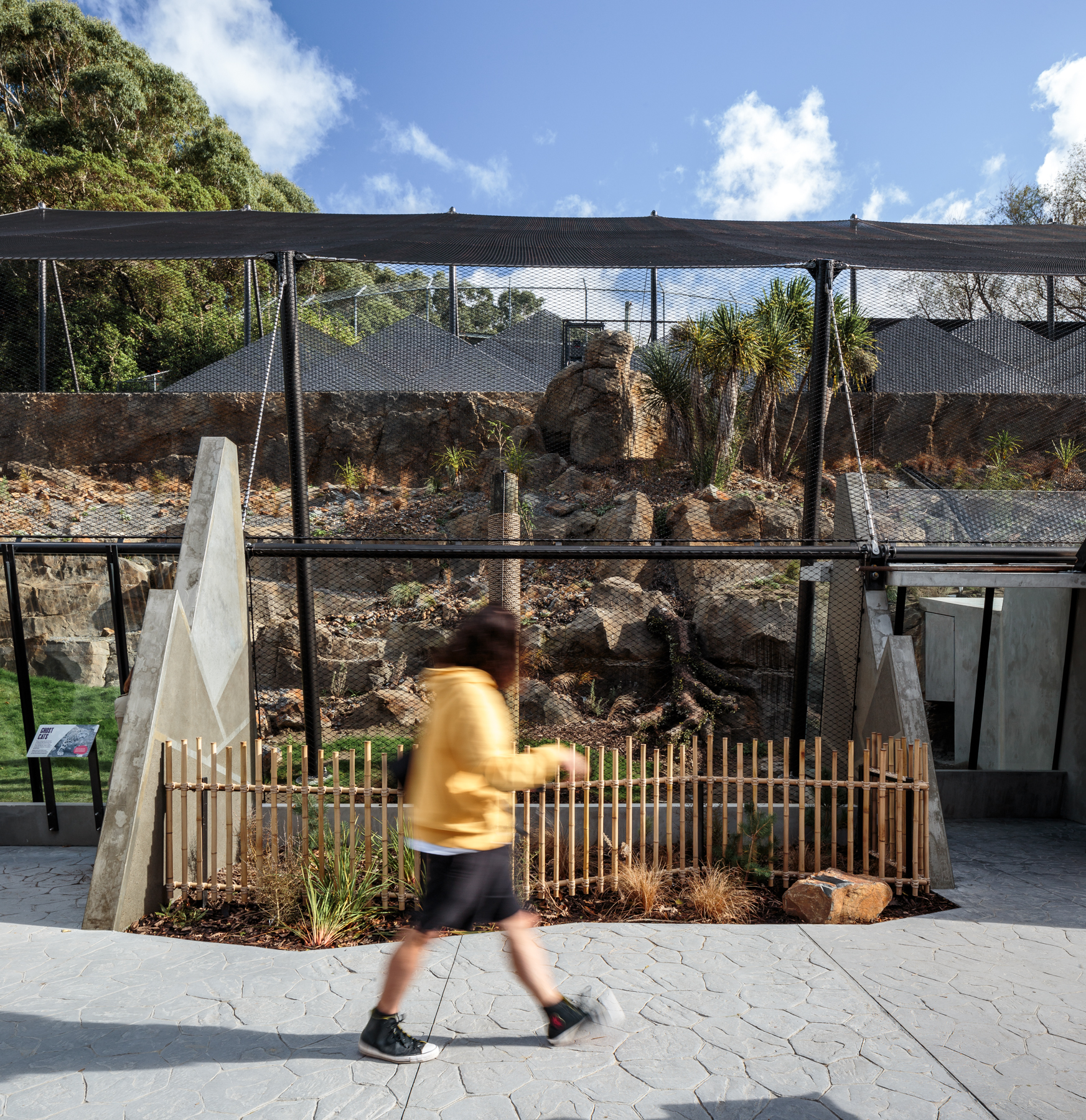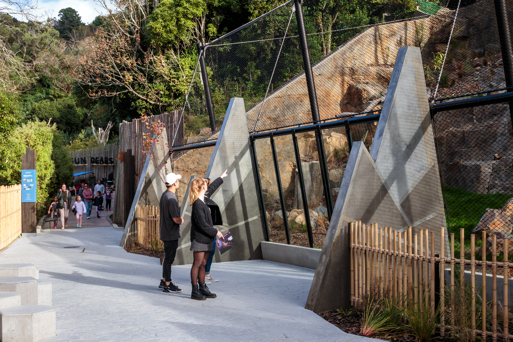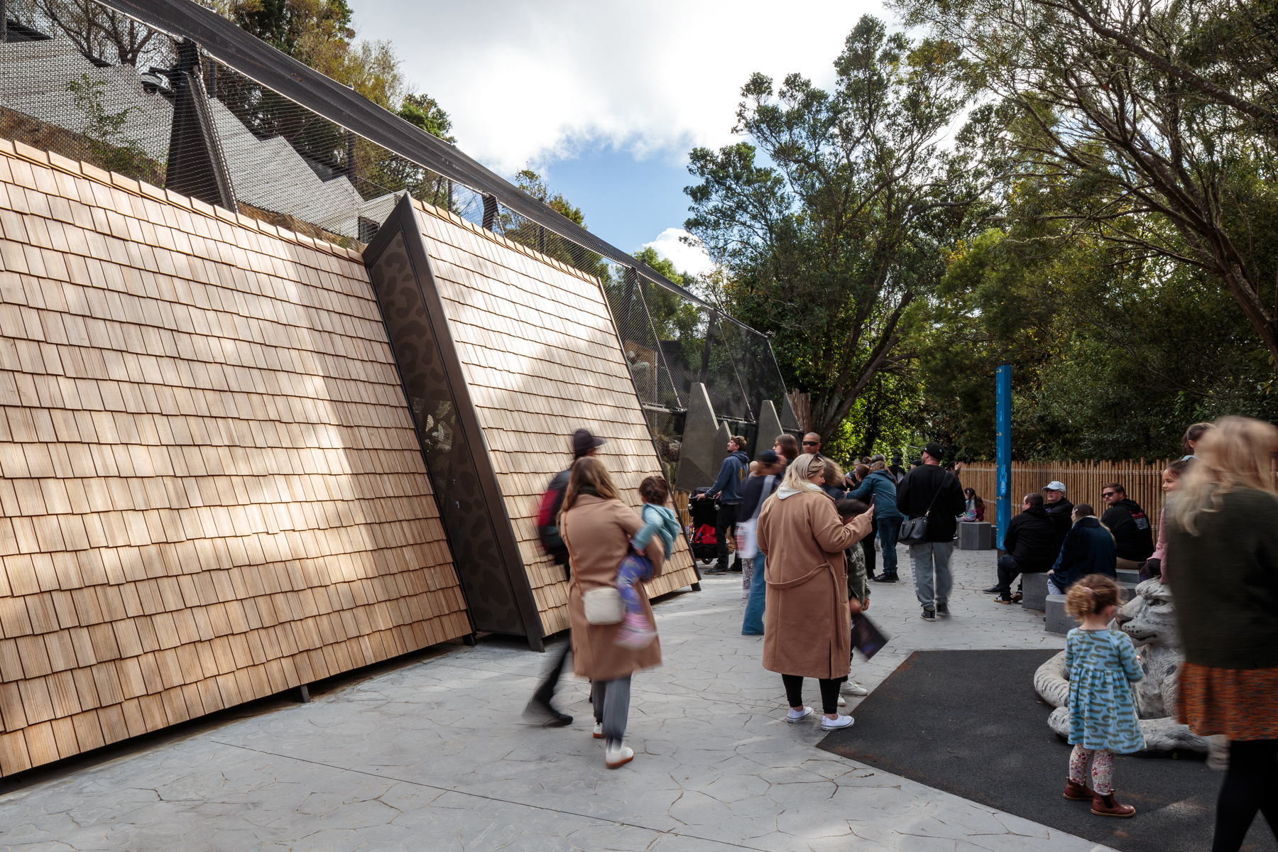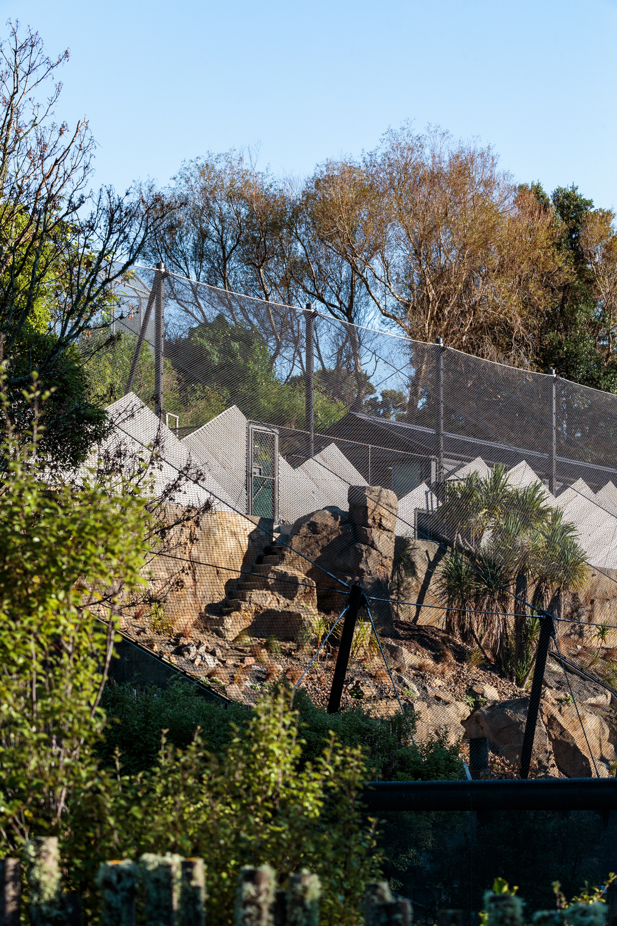 The architects have successfully juggled the spoken brief and silent needs of all involved in this project. The snow leopards seem to relish their new environment, leisurely sleeping on the sheltered purpose-made dens, providing visitors with the experience of seeing these majestic creatures up close. Perching areas give a more distant view and allow privacy for the animals, on their own terms. The enclosure’s hard landscape is sustainably built, reusing the old sun-bear enclosure materials as fill, minimising waste removal in line with the zoo’s sustainability goals. The paramount safety of the zookeepers is integrated into the design. Black steel mesh, a key safety feature, and its supporting structure anchored in precast buttresses, is cheerfully detailed with snow-leopard markings. The project, designed through the Covid period, speaks to the animals’ native landscape, while anchoring the visitor experience here in Te Whanganui-a-Tara and the country’s oldest zoo.
