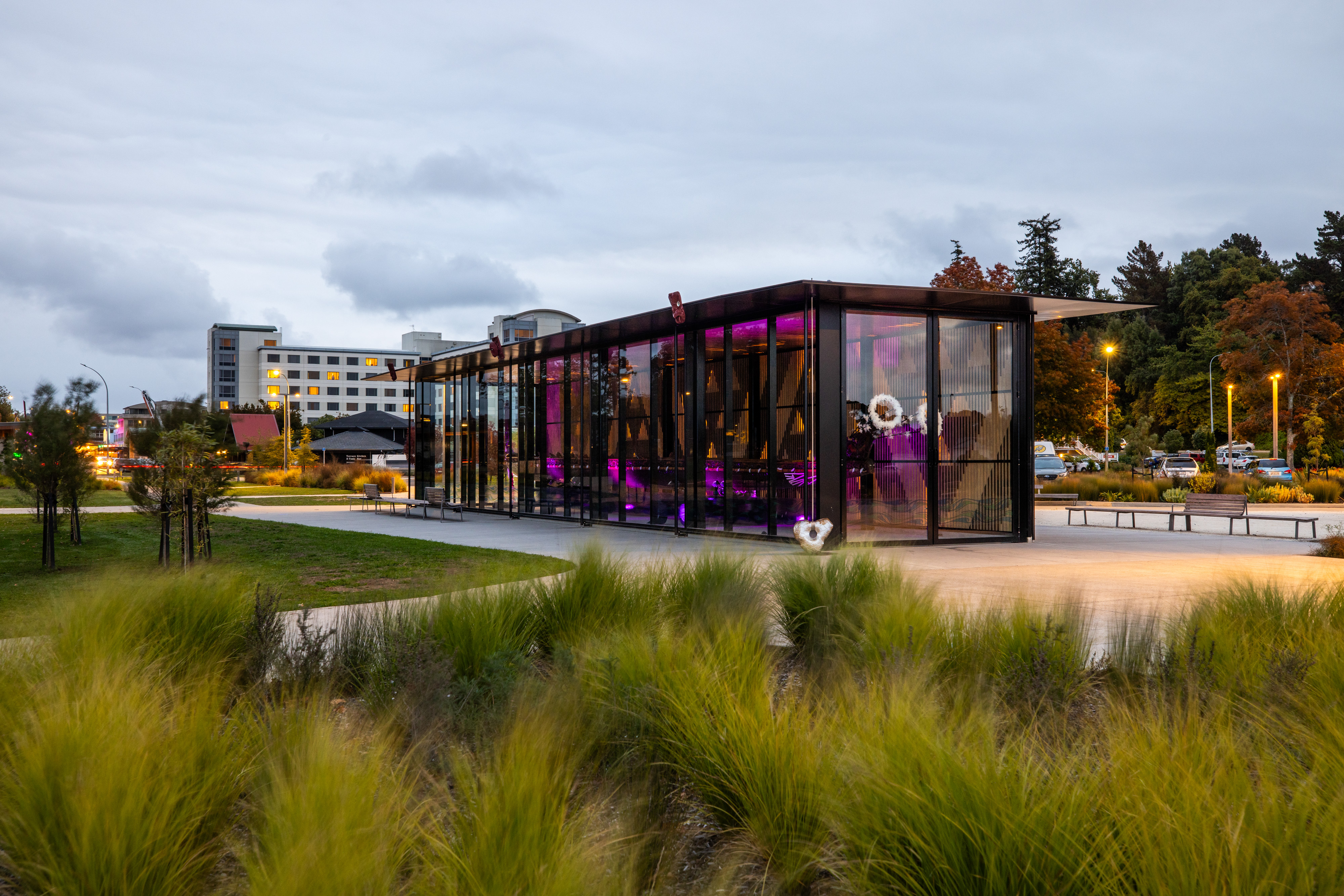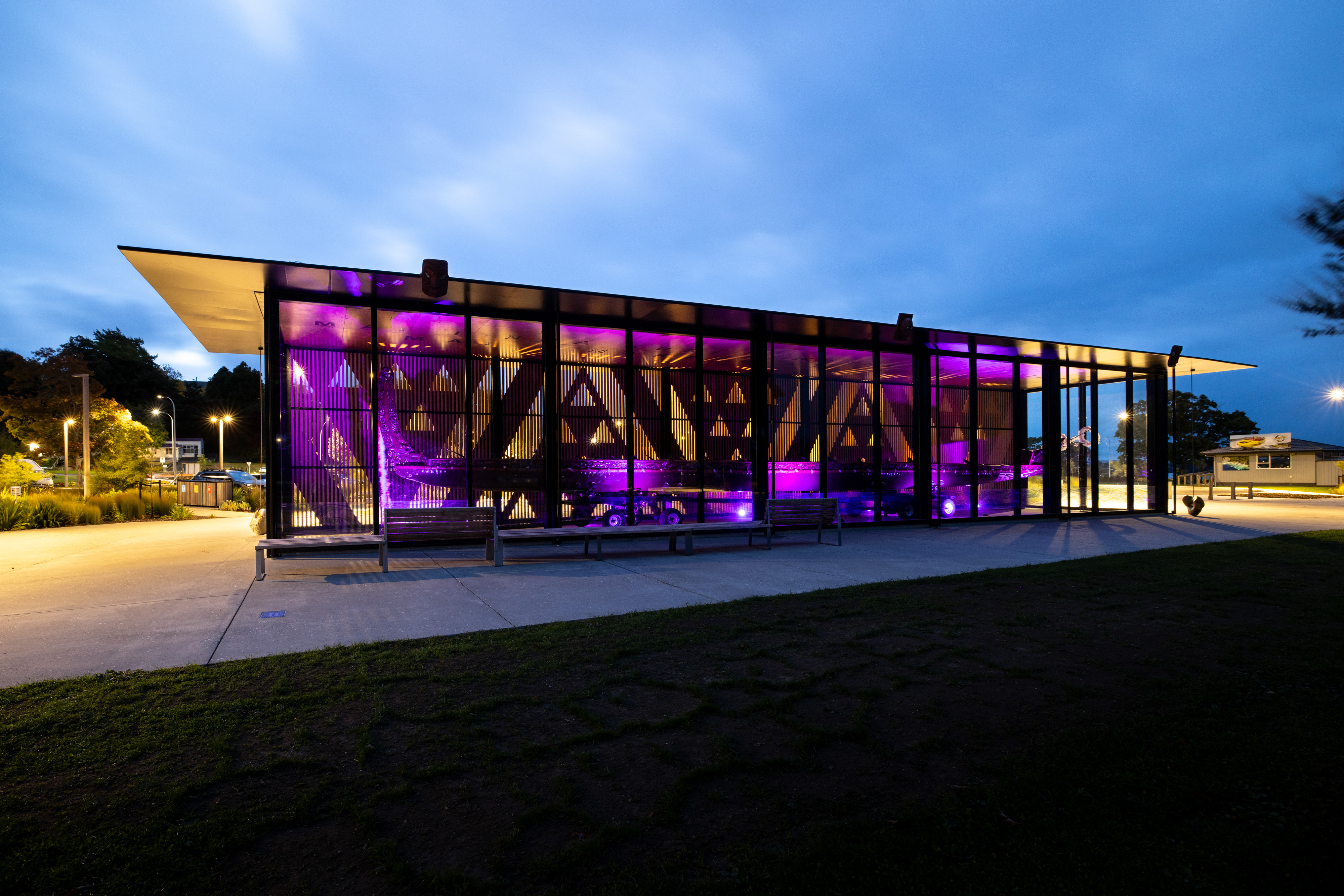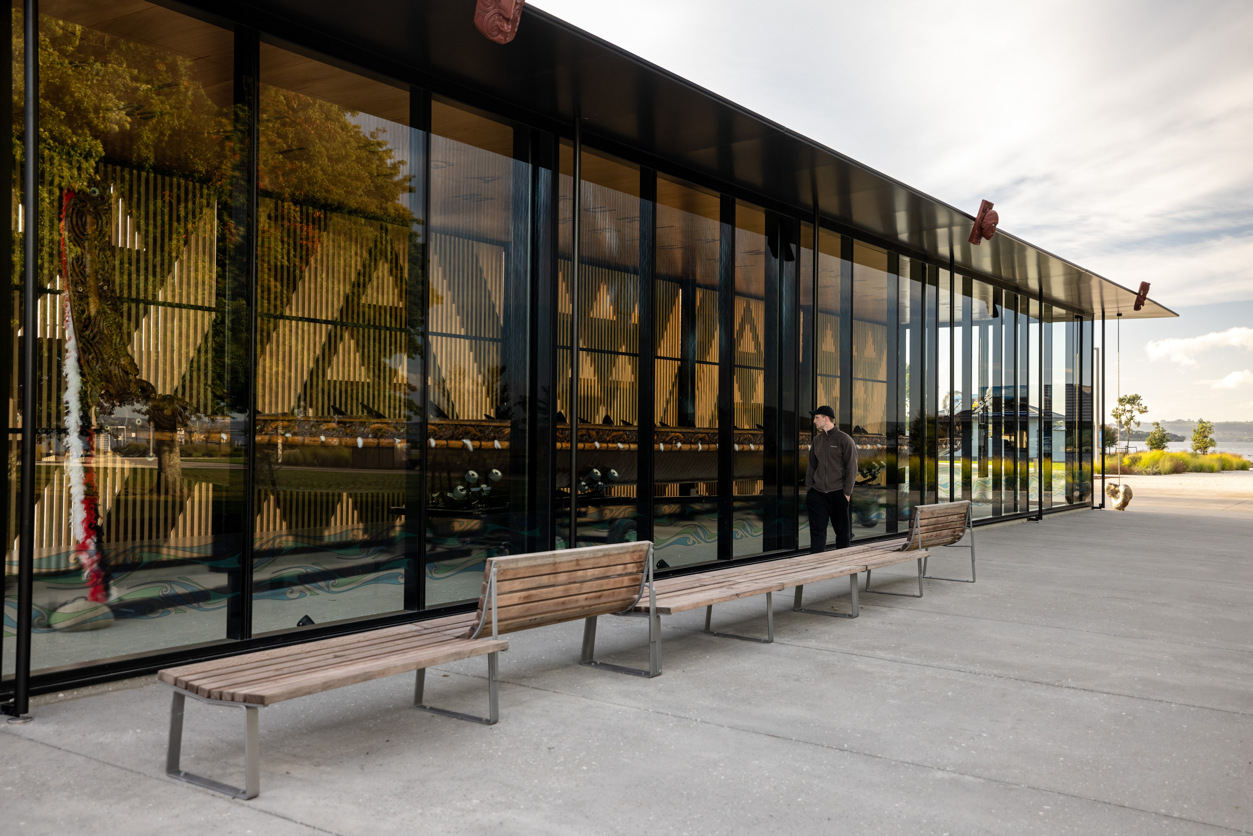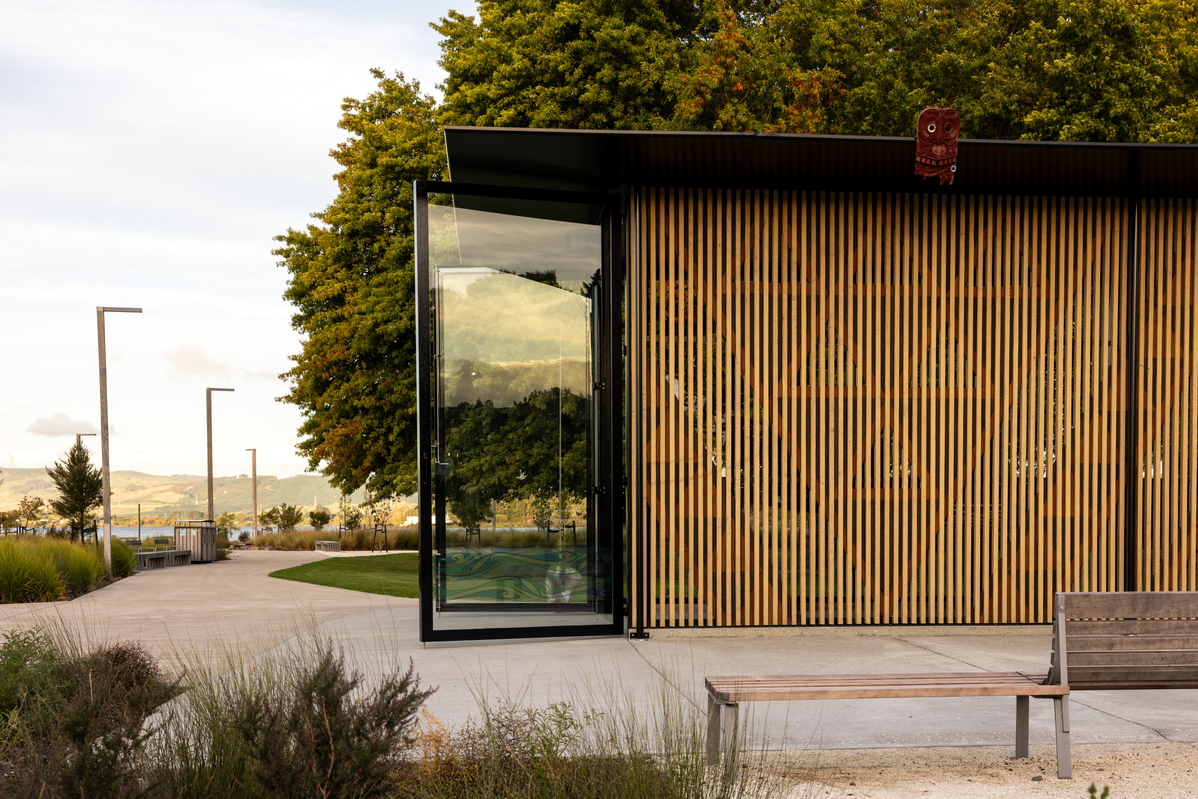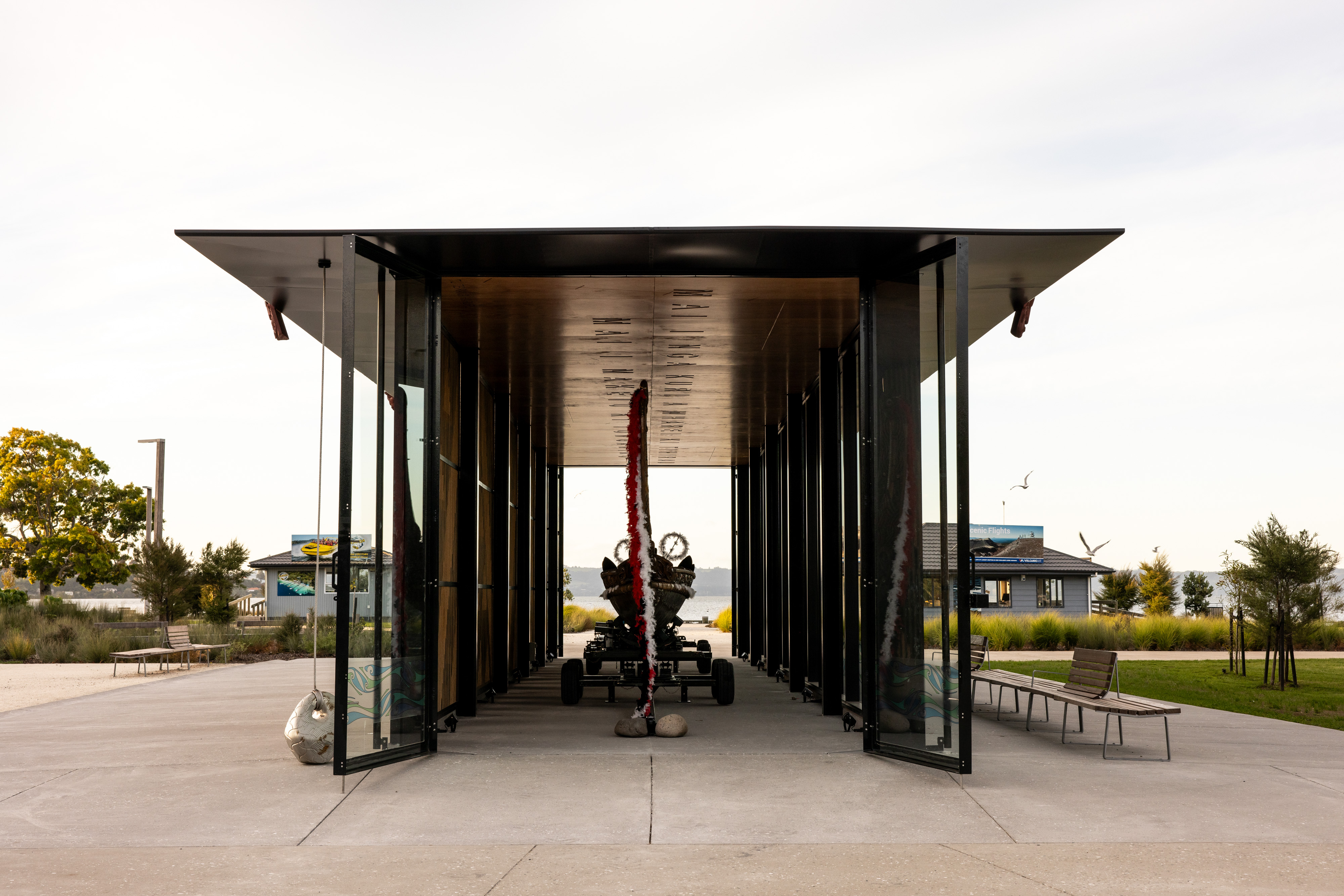 This delightful whare iti is a powerful reminder of how much activation a small shelter can have. The final piece of the Rotorua lakefront development is orientated on an ancestral Tongariro / Maketu ley line and also on the sightline from the downtown ‘Eat Street’ precinct. A narrow but long form determined by the waka is built primarily from glass and a steel structure on three sides to create a minimal interruption to the landscape. The slim roof profile features a bespoke gutter system that integrates with the extended eaves, creating an elegant weightless form. The large glass doors on the north end allow direct access to Lake Rotorua. Inside on the birch ply ceiling we are reminded of the ley lines typographically, with the ancestral narratives etched onto opposing corners of its length. The ceiling also draws forms from the precision joins and lashings found on the waka itself. Tribal tāniko patterning interleave the slatted timber screen, creating a slow reveal when approaching from the west, providing protection from the late sun and creating ever-shifting forms that oscillate with the light before it descends behind Mount Ngongotahā. A thoroughly pleasing collaboration between the architects, Council and iwi, notably artist and cultural advisor Lyonel Grant.