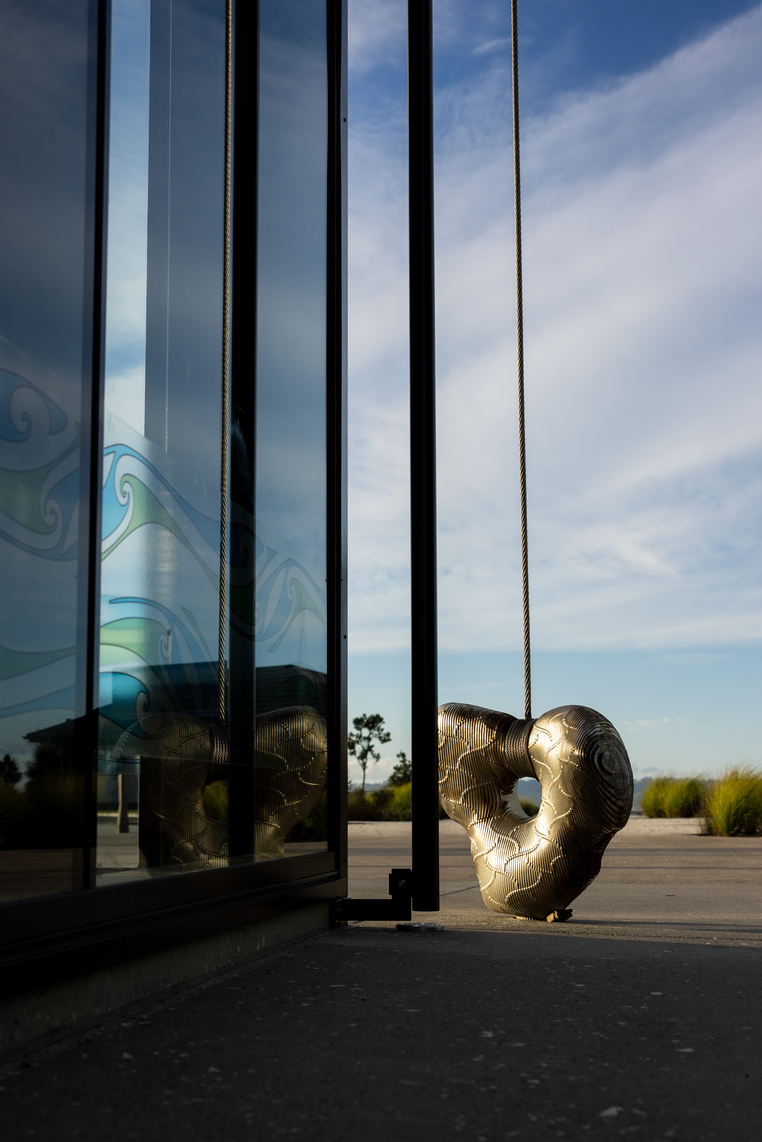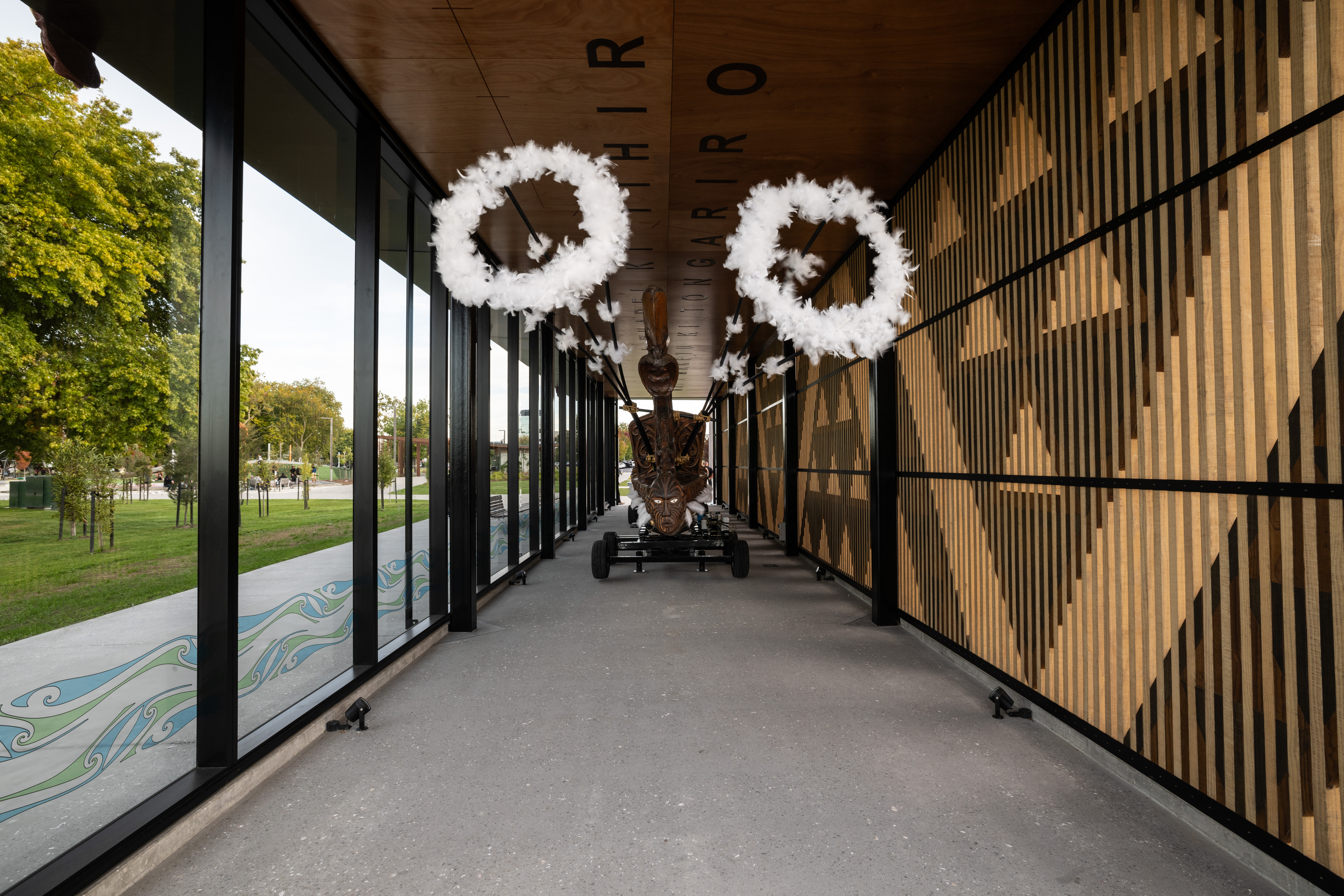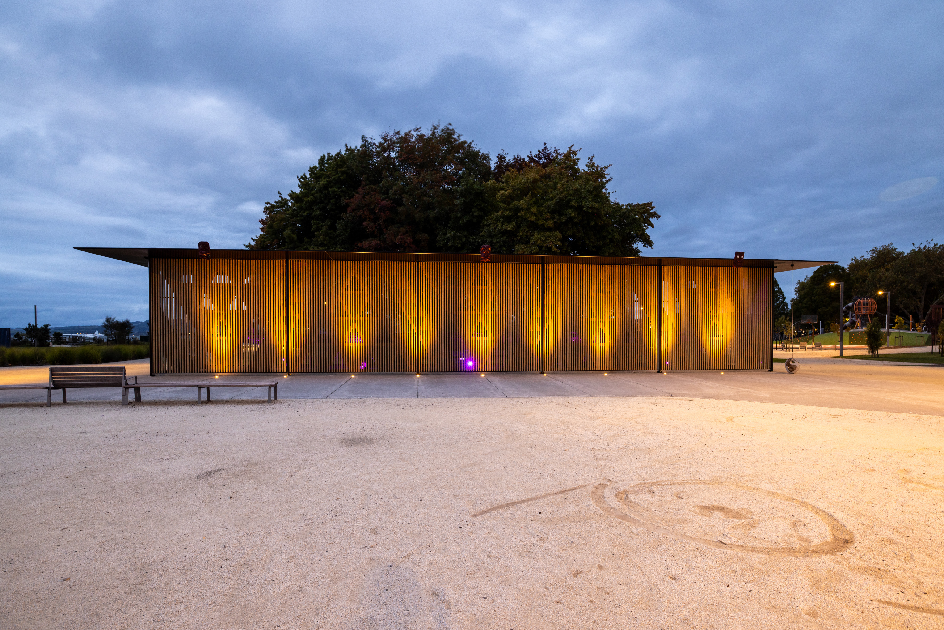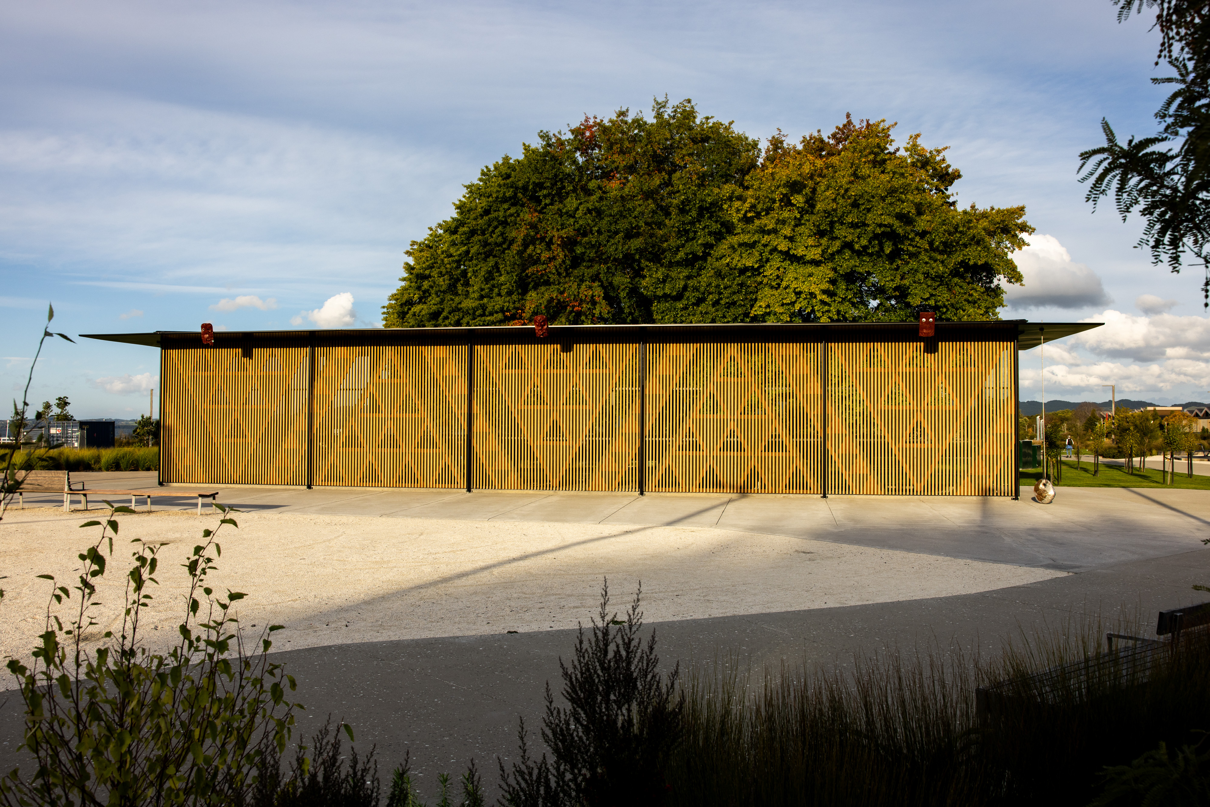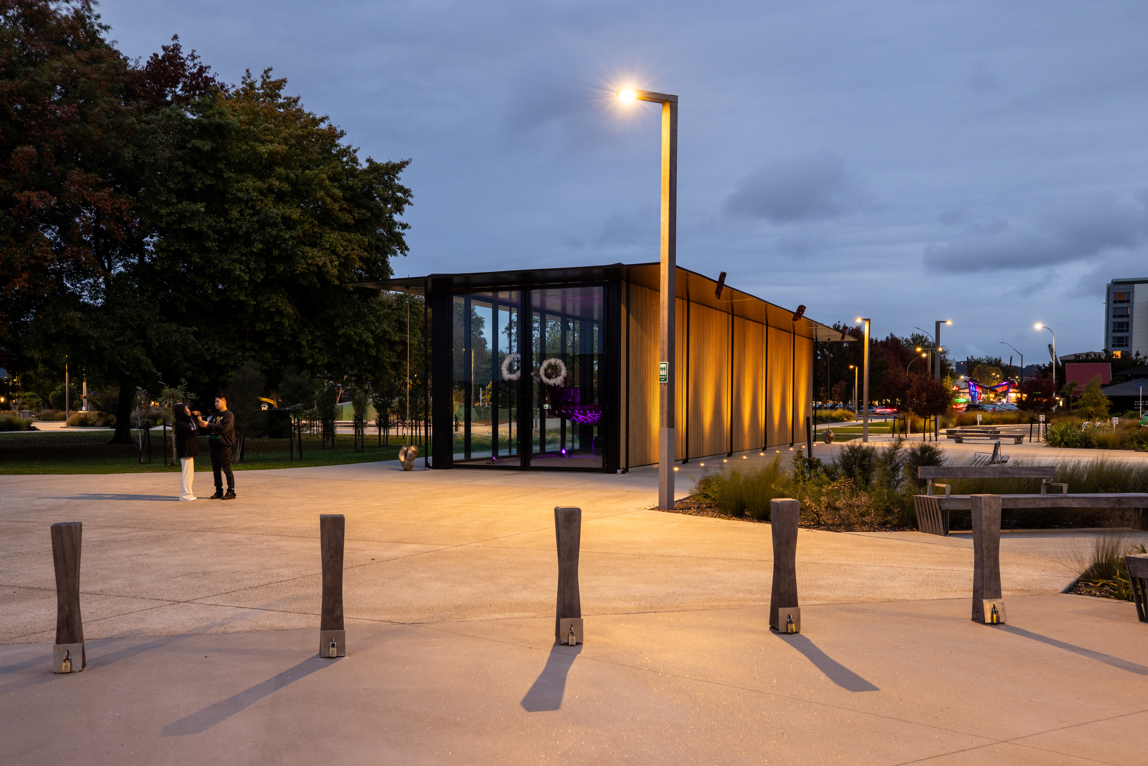 This delightful whare iti is a powerful reminder of how much activation a small shelter can have. The final piece of the Rotorua lakefront development is orientated on an ancestral Tongariro / Maketu ley line and also on the sightline from the downtown ‘Eat Street’ precinct. A narrow but long form determined by the waka is built primarily from glass and a steel structure on three sides to create a minimal interruption to the landscape. The slim roof profile features a bespoke gutter system that integrates with the extended eaves, creating an elegant weightless form. The large glass doors on the north end allow direct access to Lake Rotorua. Inside on the birch ply ceiling we are reminded of the ley lines typographically, with the ancestral narratives etched onto opposing corners of its length. The ceiling also draws forms from the precision joins and lashings found on the waka itself. Tribal tāniko patterning interleave the slatted timber screen, creating a slow reveal when approaching from the west, providing protection from the late sun and creating ever-shifting forms that oscillate with the light before it descends behind Mount Ngongotahā. A thoroughly pleasing collaboration between the architects, Council and iwi, notably artist and cultural advisor Lyonel Grant.