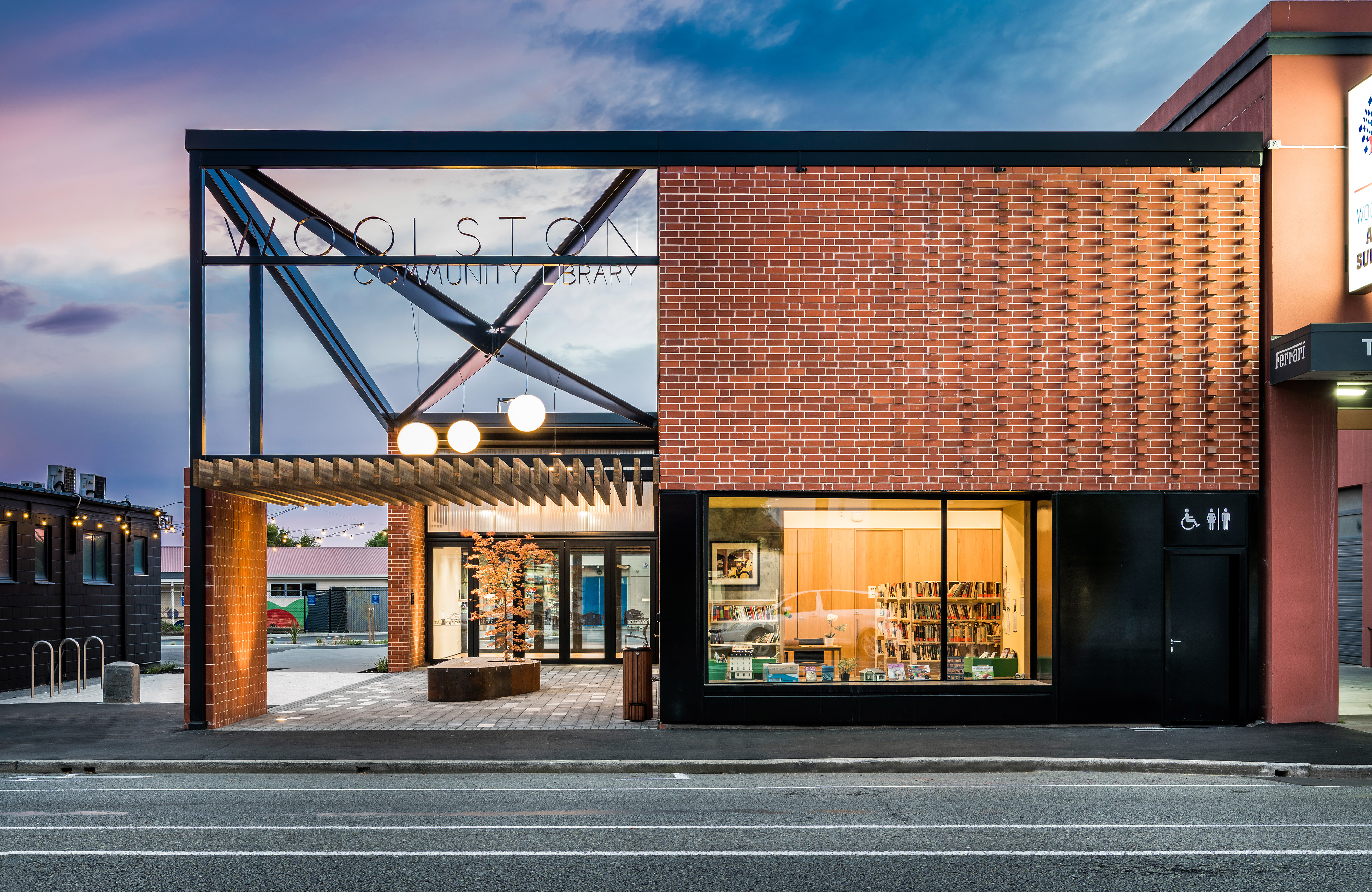 This clever piece of urban architecture combines civic space with community hall and library to inject new life into Woolston’s main street. A playful array of locally made bricks adorns the façade, speaking of Woolston’s industrial past, accentuated by black steel and timber within a simple form that references vernacular local architecture. Light-filled and adaptable spaces make this an inviting and comfortable place suitable for any activity, from intimate reading sessions through to large community events. It is a transformative step in the renewal of Ferry Road.