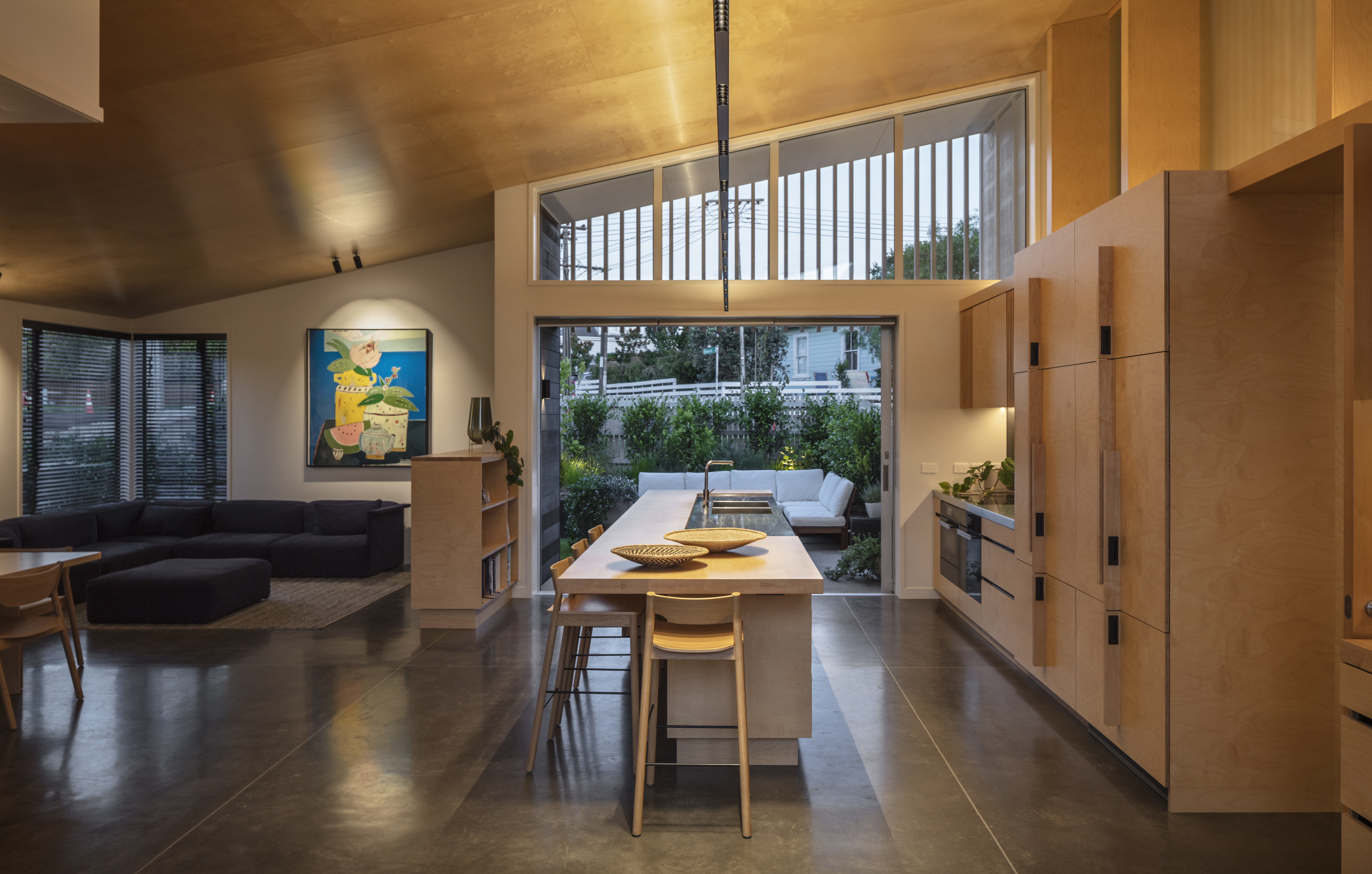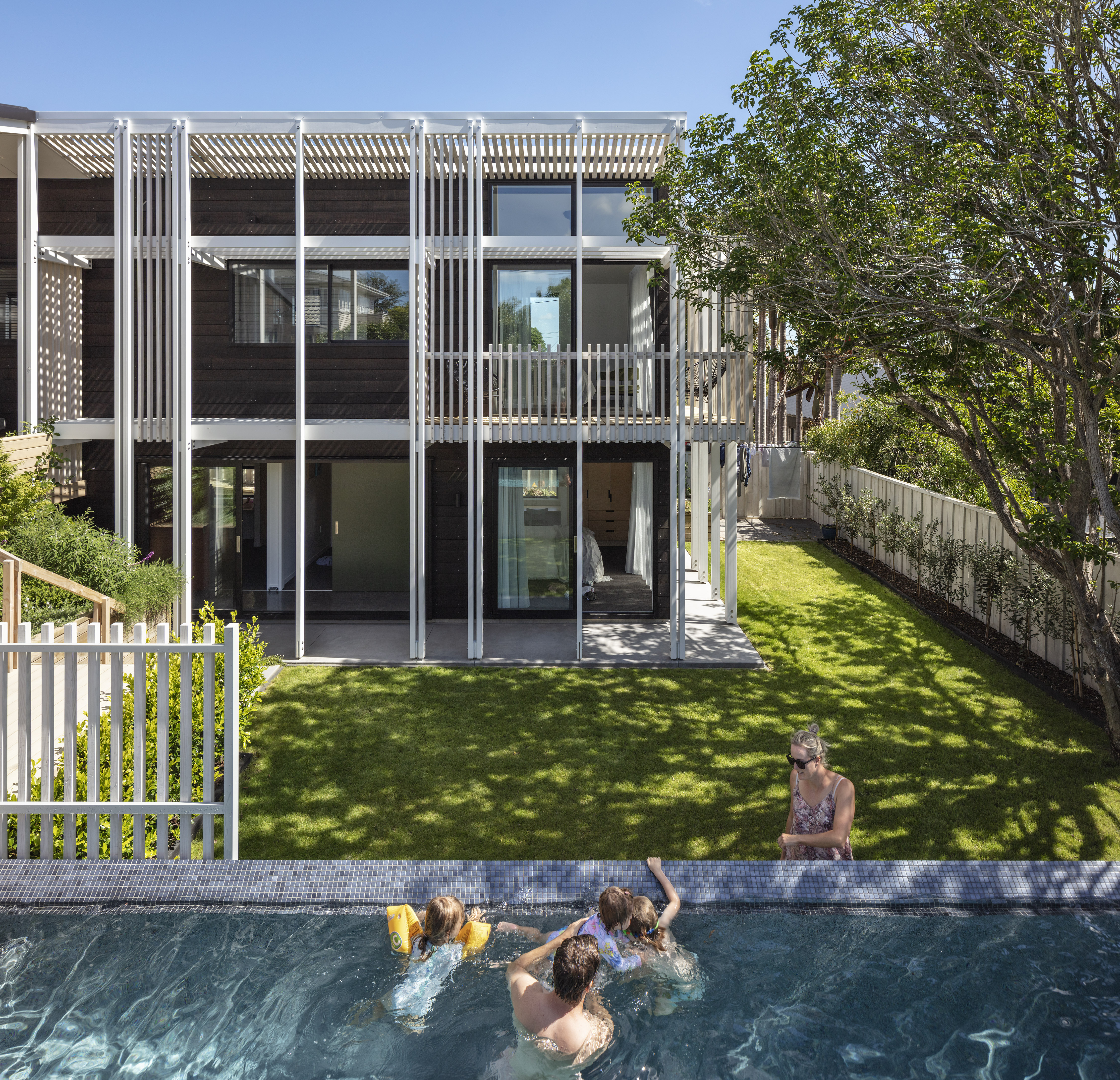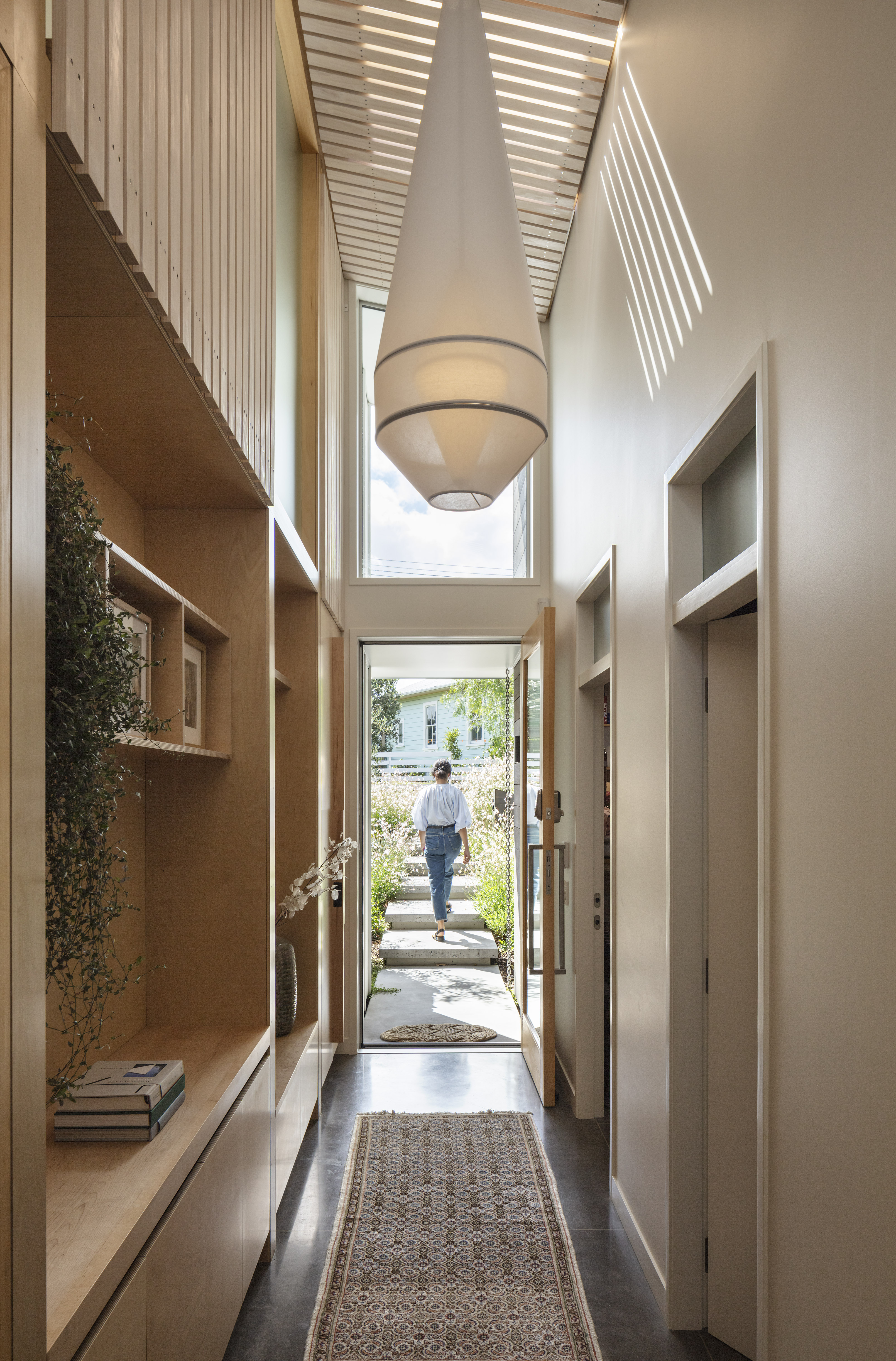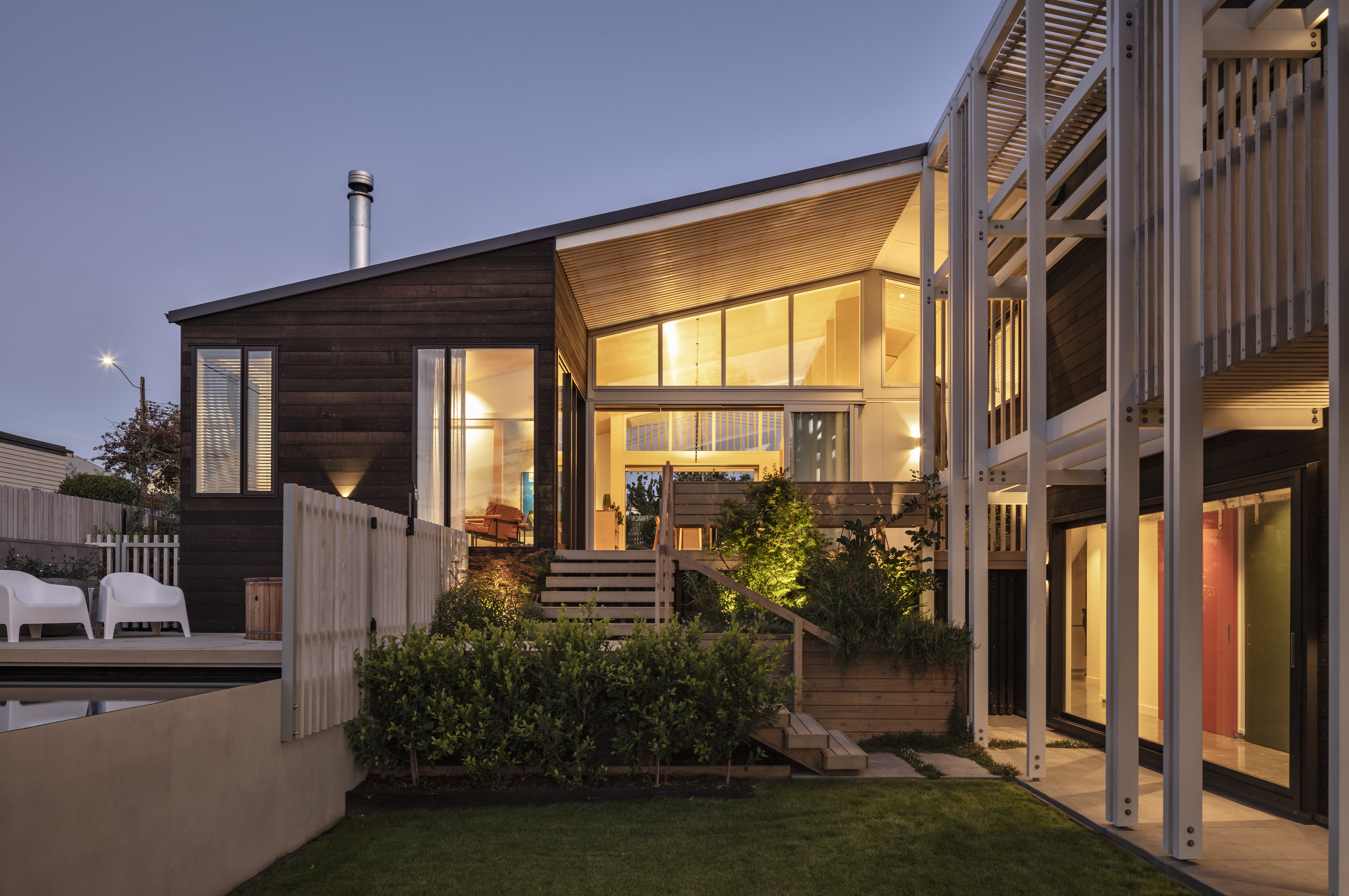 This clever response to a sloping suburban site also navigated some tight heritage restrictions. The resulting low-slung gable form sits nicely within its context, while gentle street-side landscaping and a relatively open interior creates an interesting dialogue with the road. Inside, this home features a variety of superb spaces to dwell in, with every element beautifully crafted. The backyard bedroom wing forms a surprising contrast to the front by switching to something more vertical, and thereby leaving the backyard free for outdoor living and an amazing tiled pool.