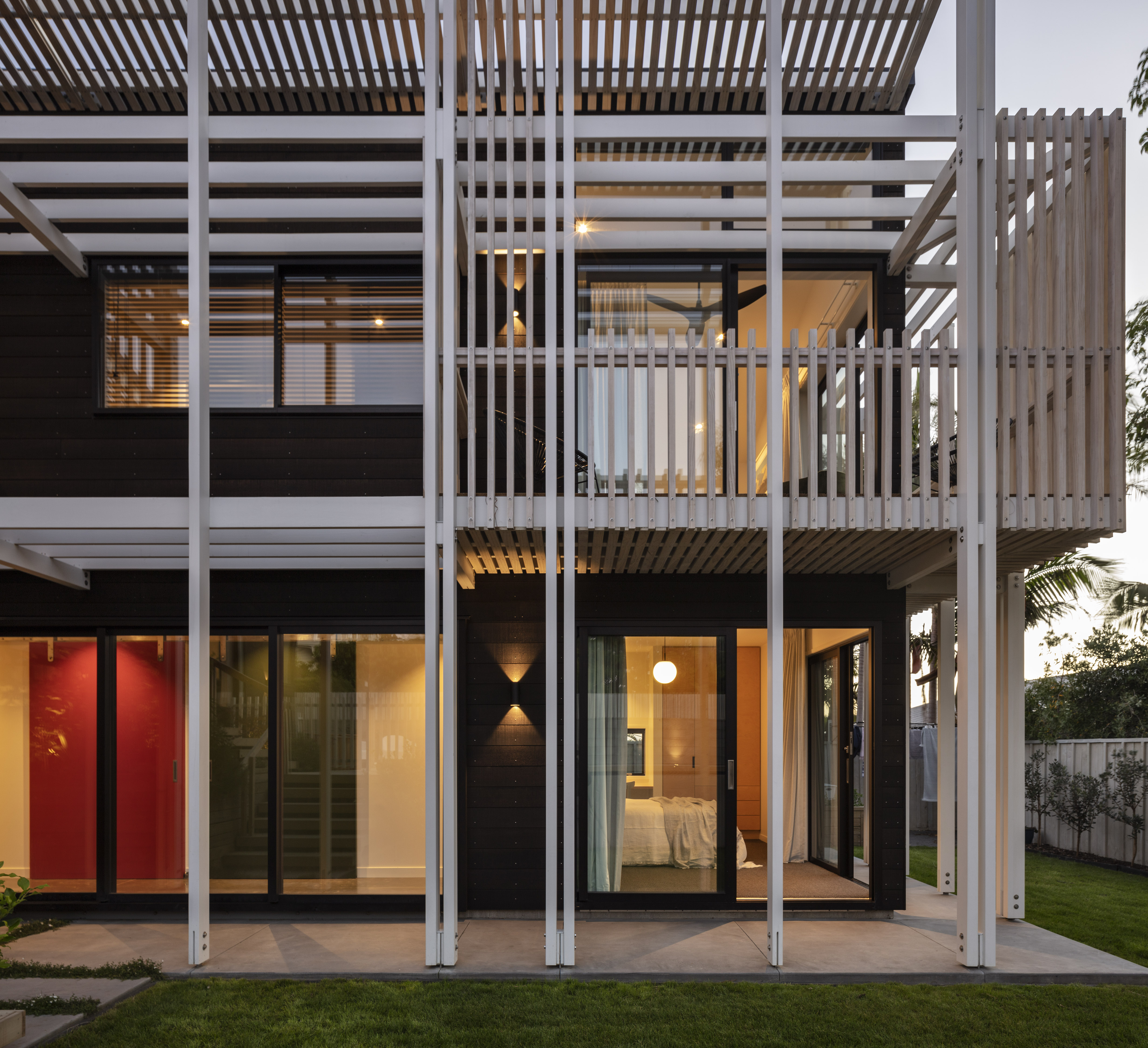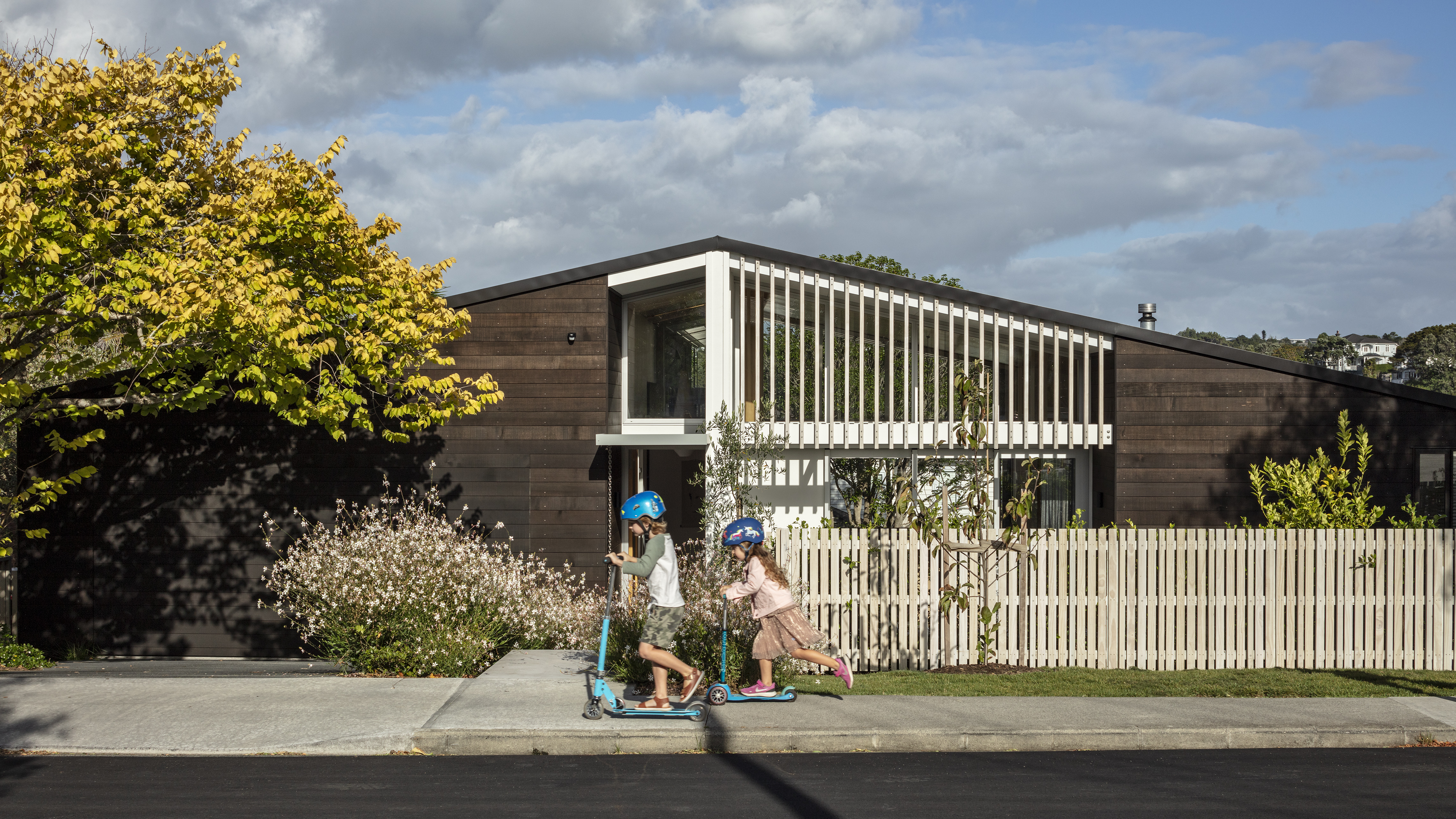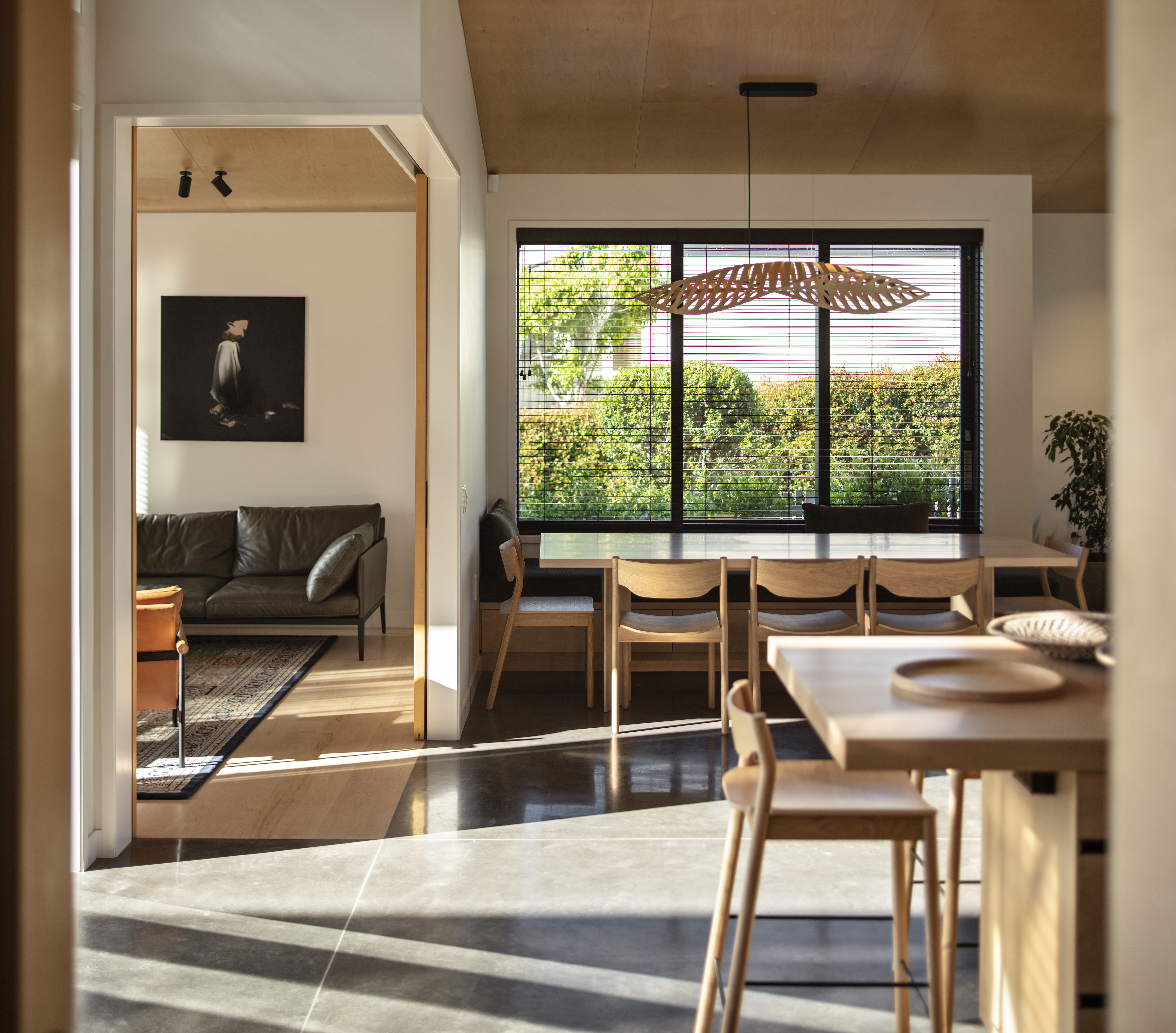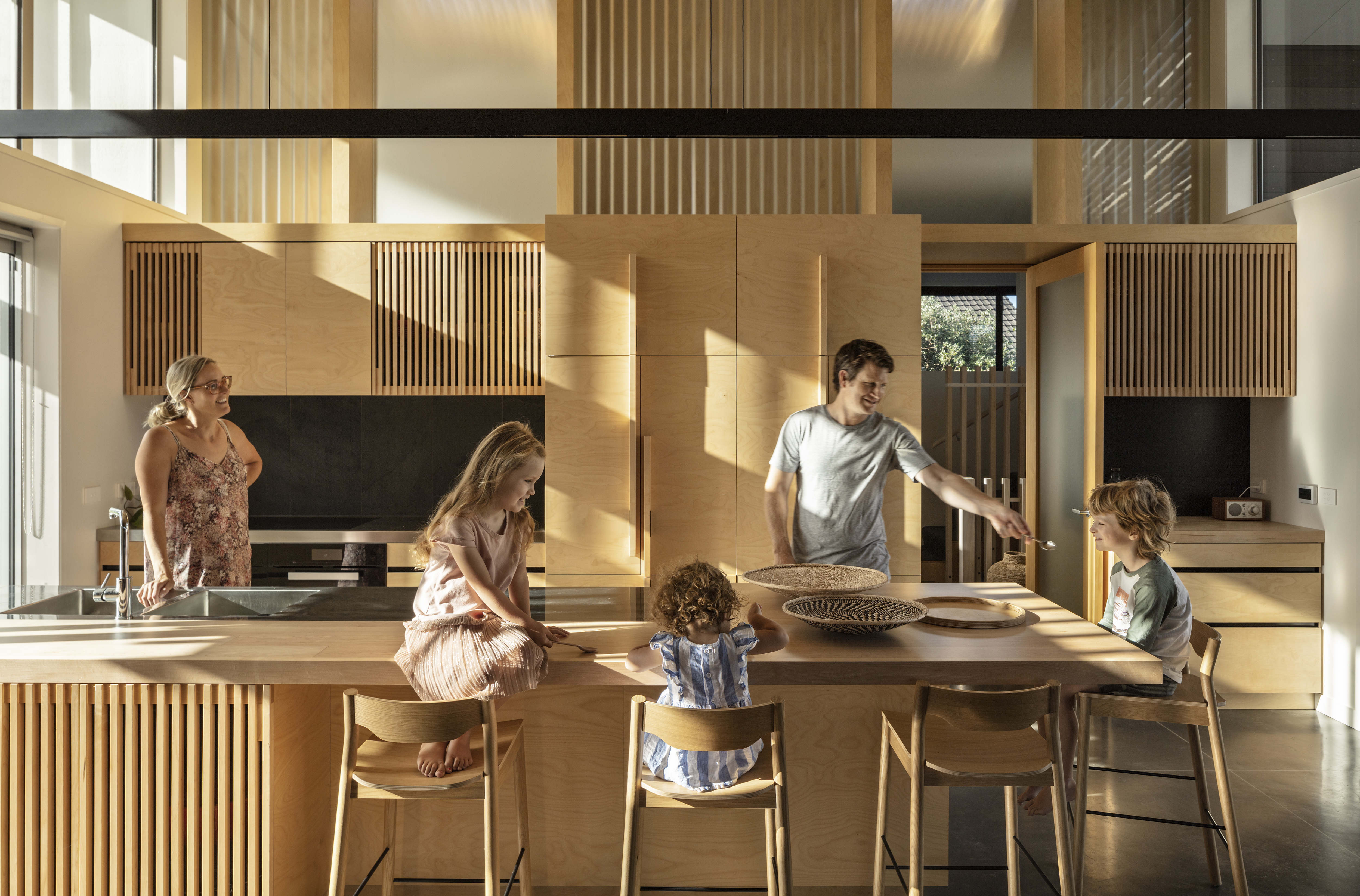 This clever response to a sloping suburban site also navigated some tight heritage restrictions. The resulting low-slung gable form sits nicely within its context, while gentle street-side landscaping and a relatively open interior creates an interesting dialogue with the road. Inside, this home features a variety of superb spaces to dwell in, with every element beautifully crafted. The backyard bedroom wing forms a surprising contrast to the front by switching to something more vertical, and thereby leaving the backyard free for outdoor living and an amazing tiled pool.