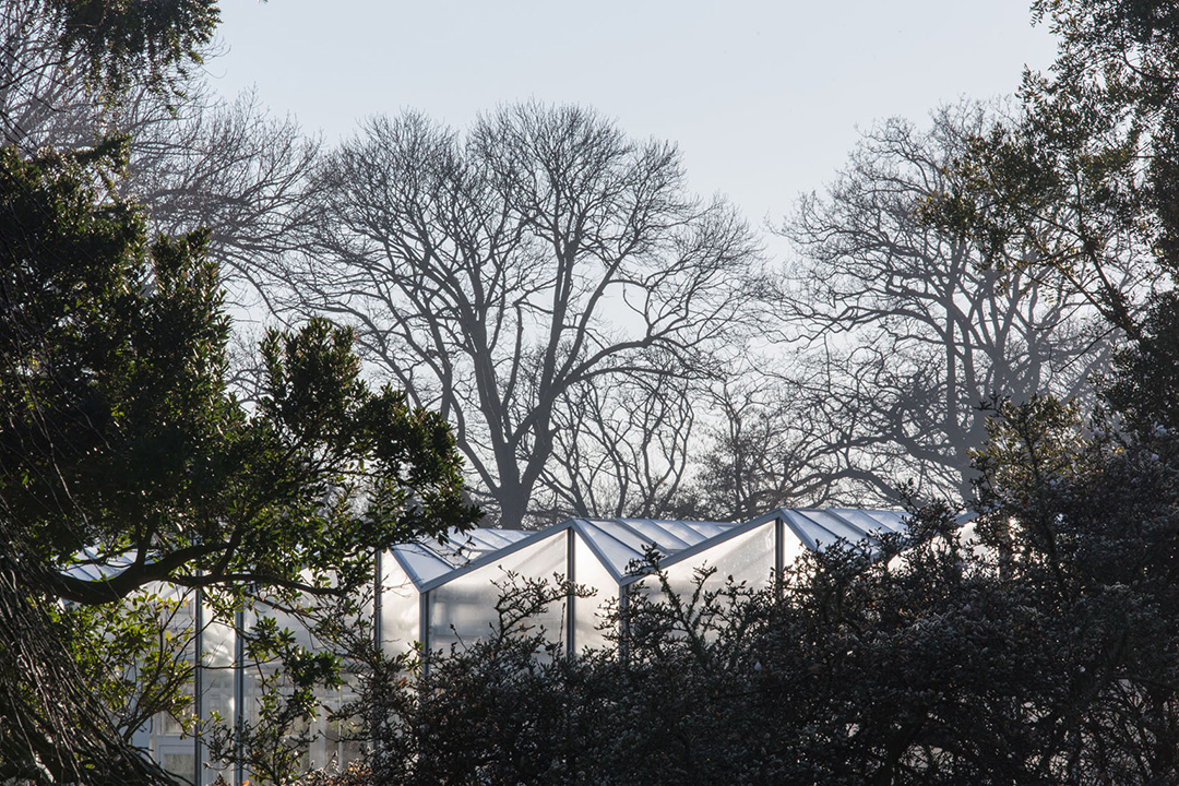 The light-filled white building opens out to a wide expanse of lawn. The building looks like a giant contemporary greenhouse. The saw-tooth roof is a feature typical of traditional industrial greenhouse design. Photo By Emma Smales