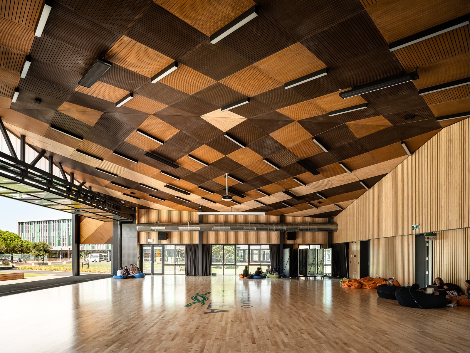 The Whare Tapere (Te Rehu) ceiling uses three stains to the perforated plywood acoustic ceiling panels to create a pattern representative of the tuna (eels) found in nearby waters. Photo by Dennis Radermacher.