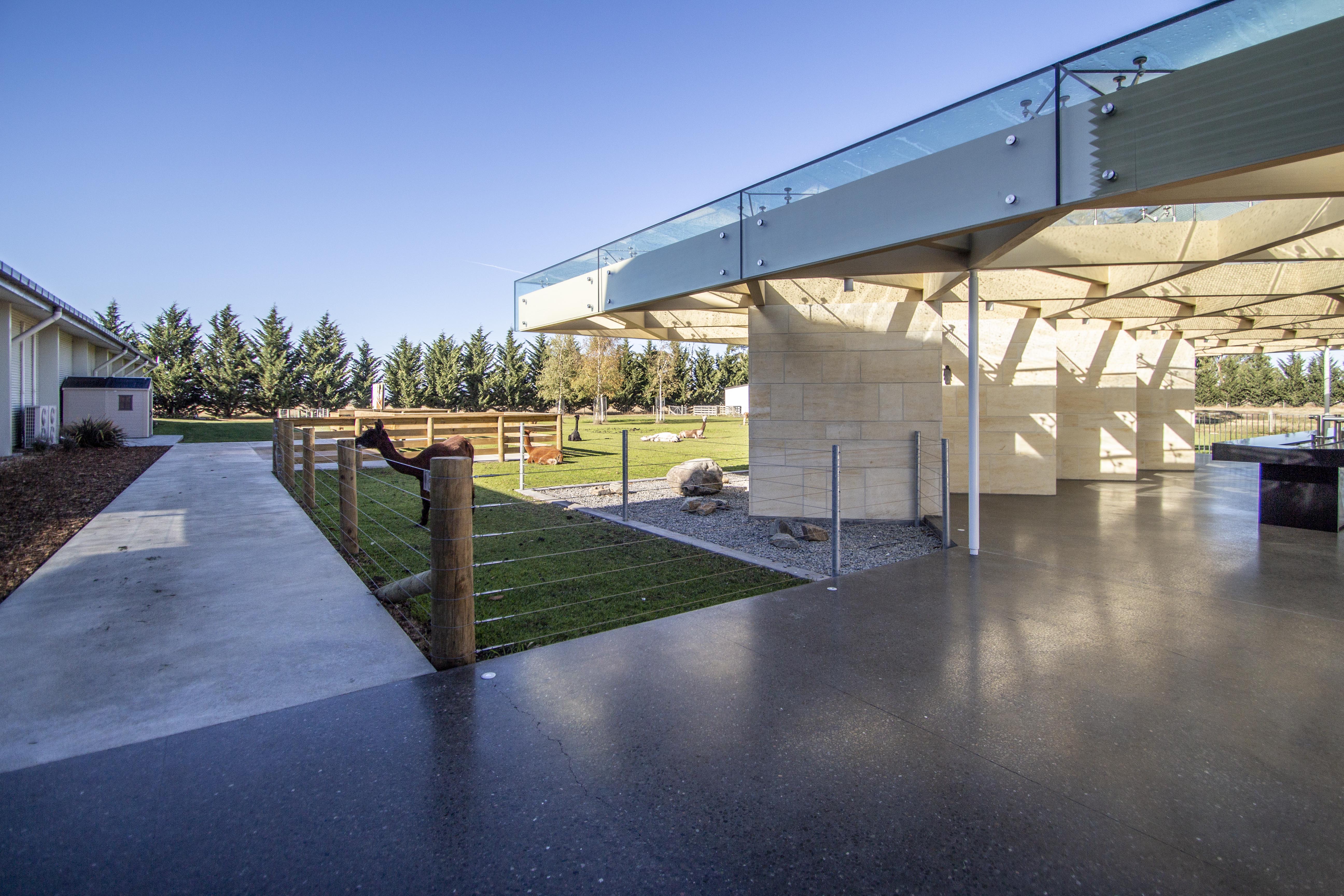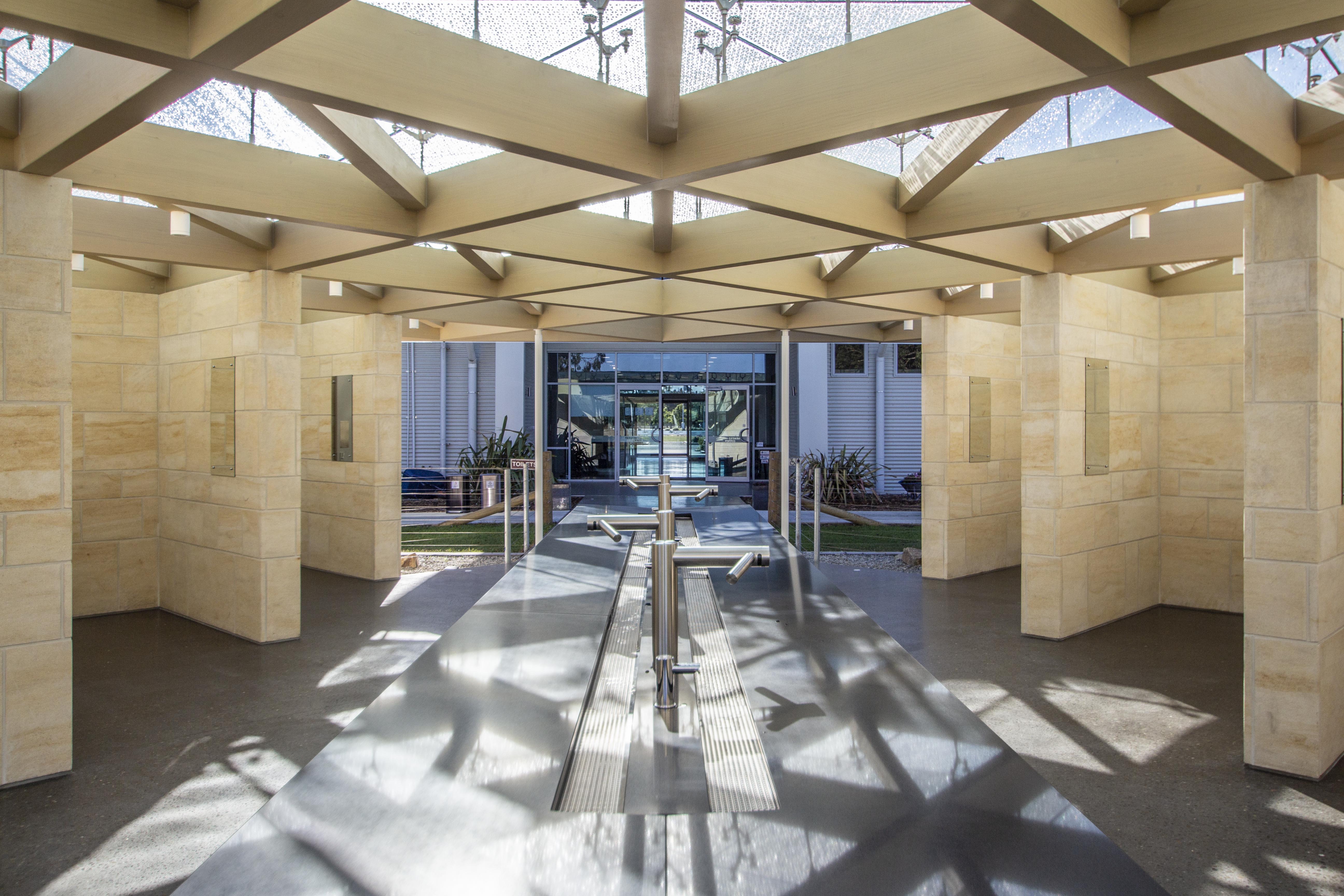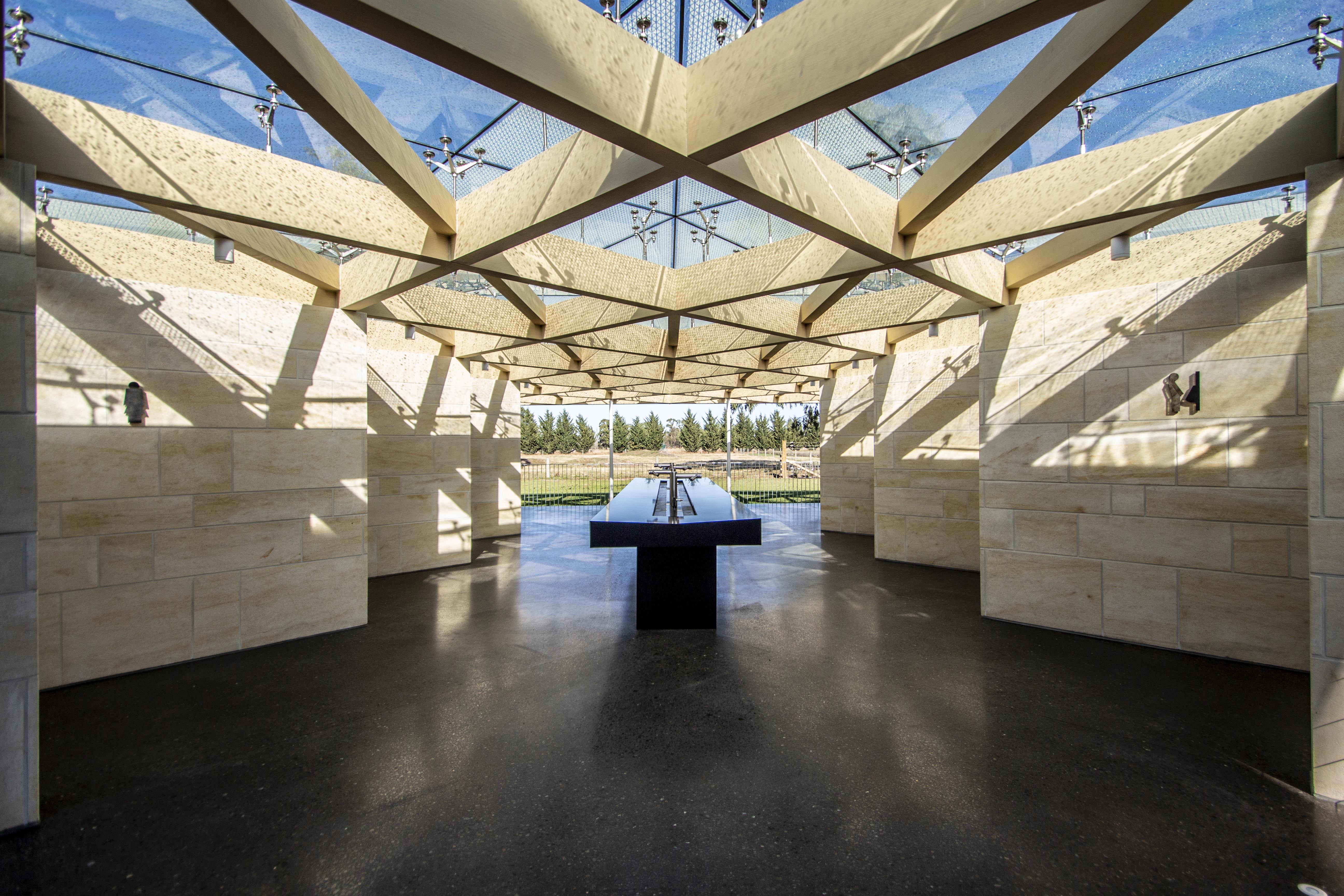Seldom is the term ‘experience’ associated with an ablutions block, at least not in a positive sense. However, visitors to Farmers Corner are treated to just that. A latticework of exposed glulam beams is perched upon a series of appropriately clad Oamaru