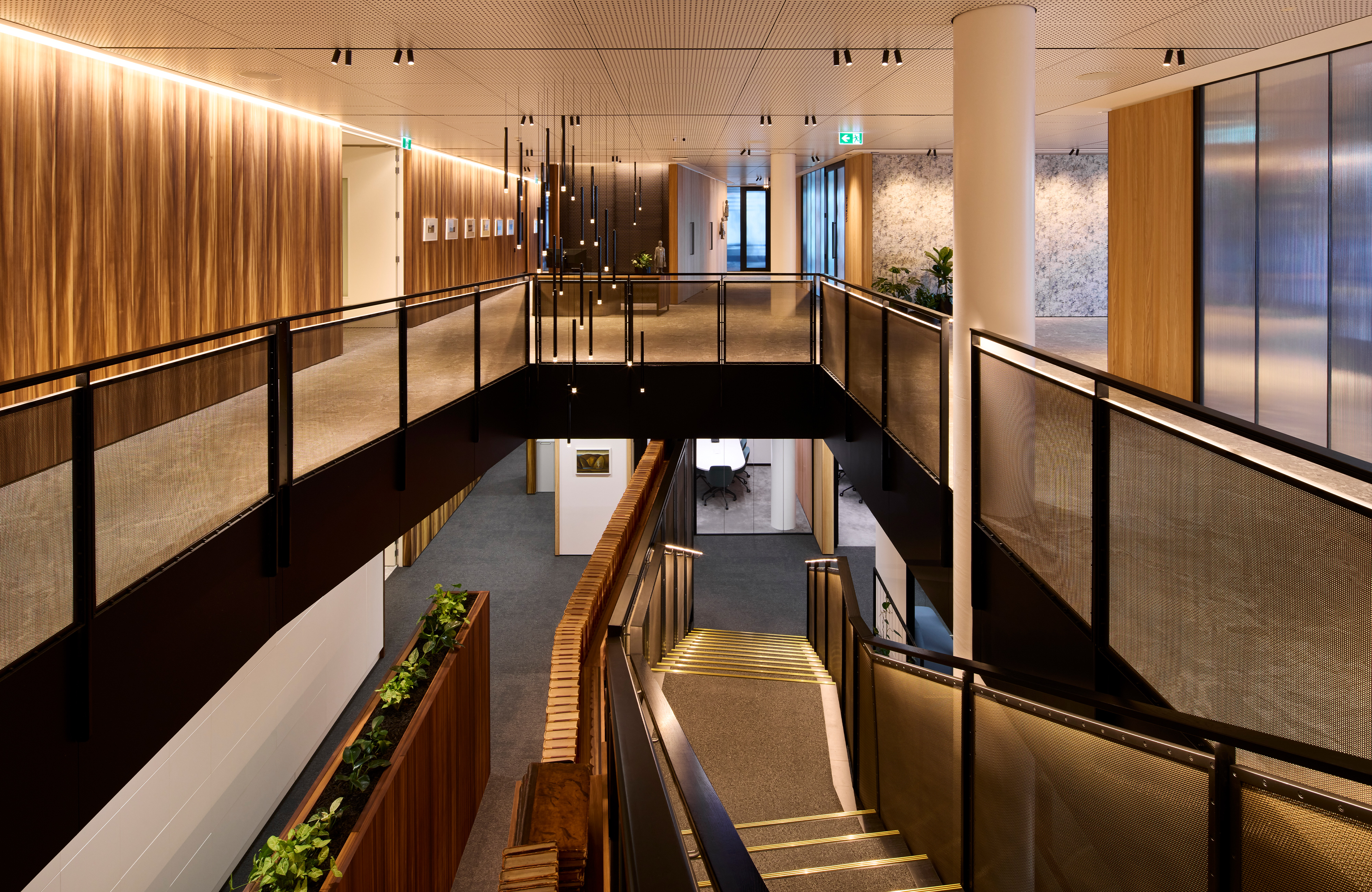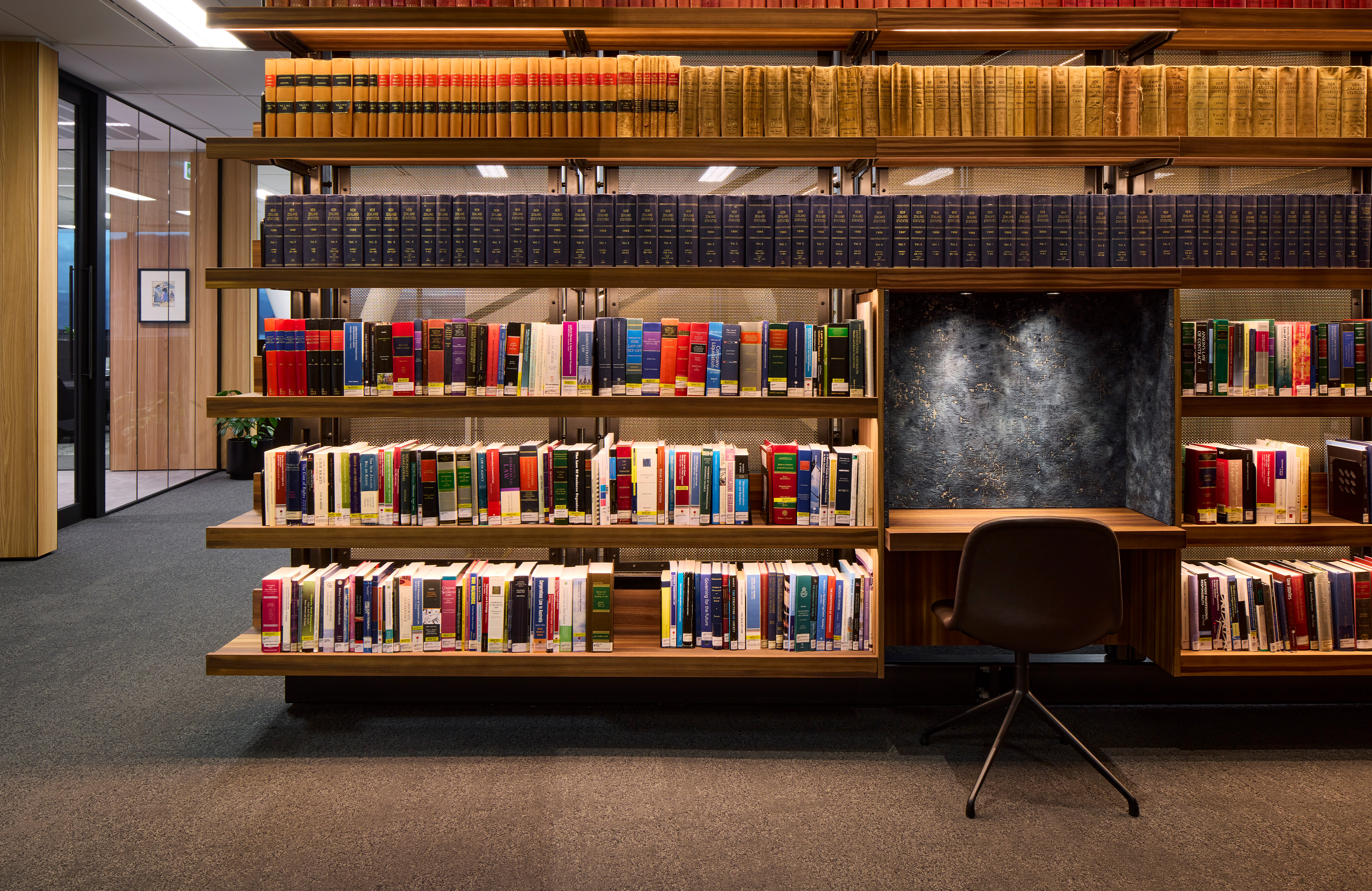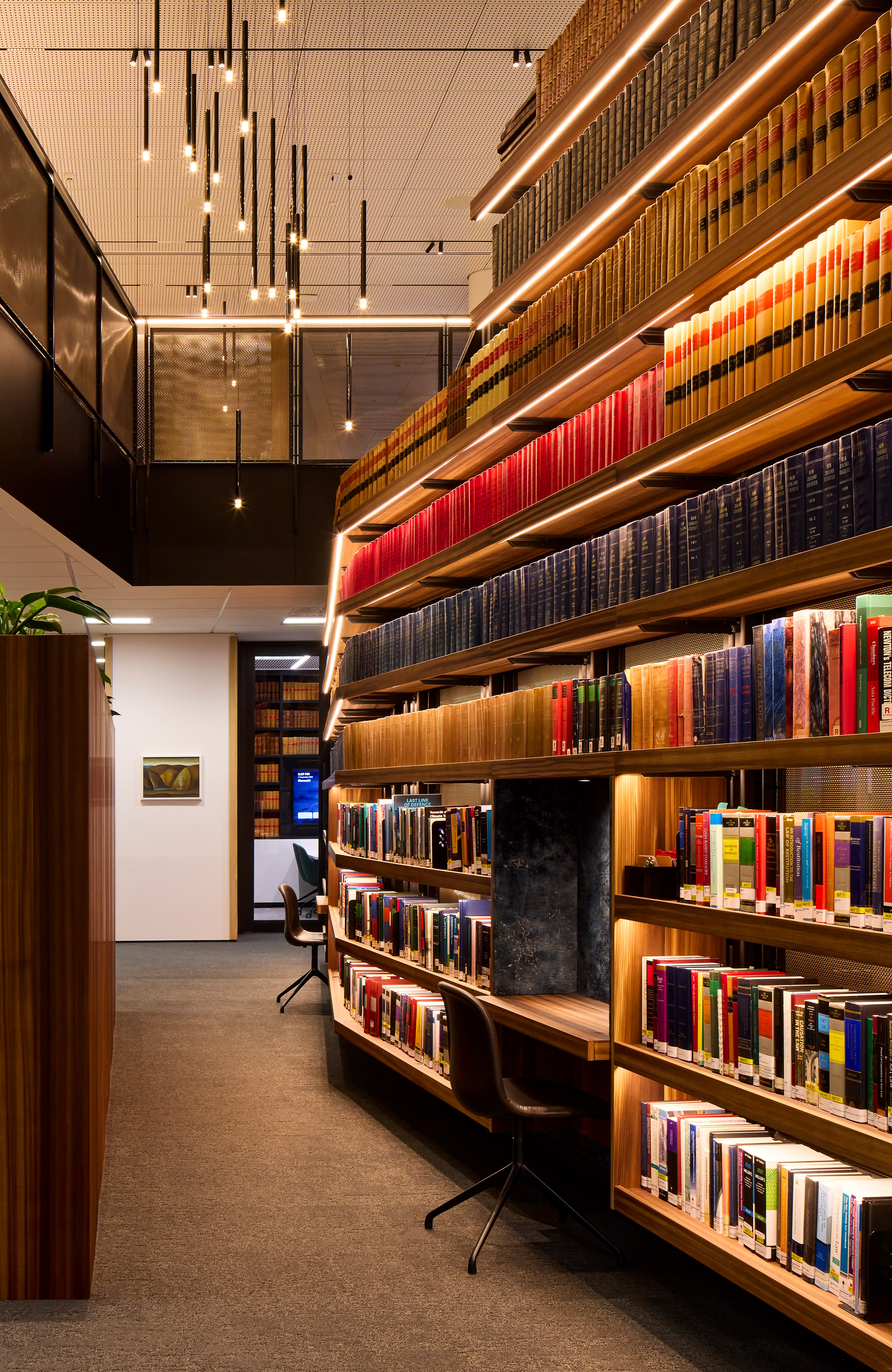 A fantastic setting over two floors in the middle of the recently completed Deloitte building on Customhouse Quay maximises views over the harbour to the eastern hills. The selection of finishes from spaces at the back to the front create a legible narrative that relates to the layered hills seen in the evening light. Advantage was taken of a hole between the two floors made during construction and the result is a triumphant open stair with a double-height wall of books – a centrepiece that links both floors. Carefully considered lighting of stair treads and books adds significant impact. Materials, furniture and lighting come together to create an environment of exceptional quality.