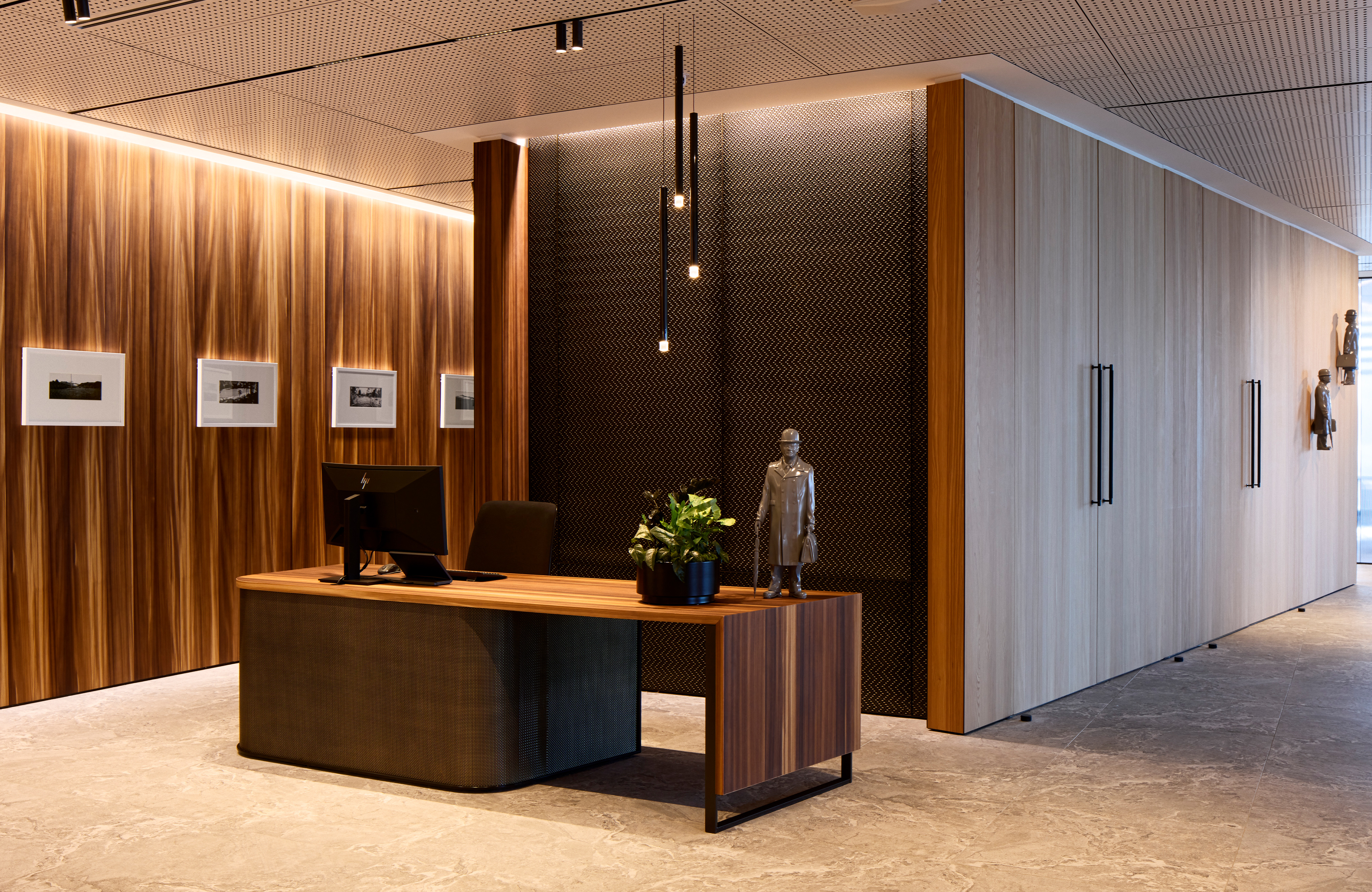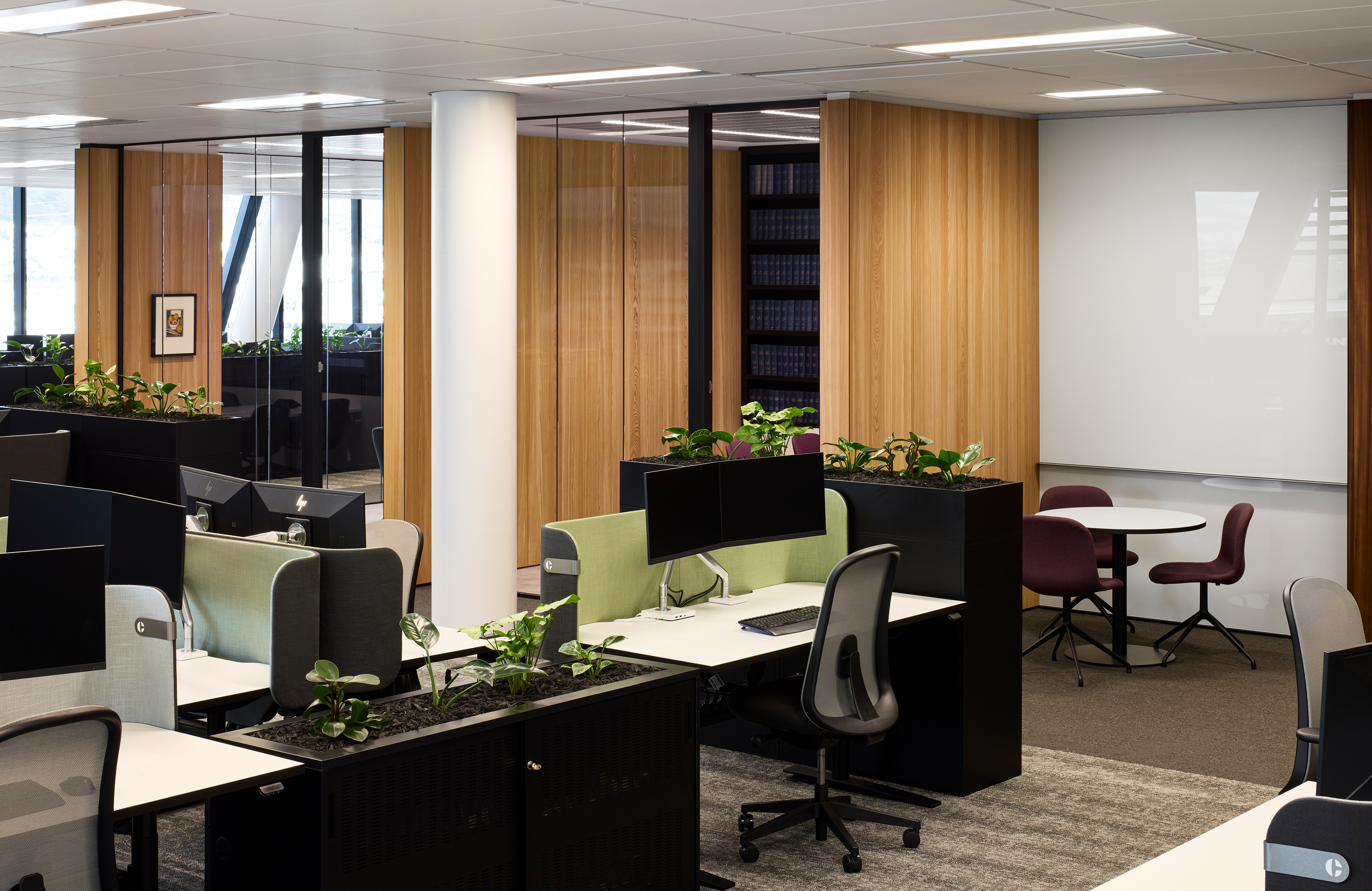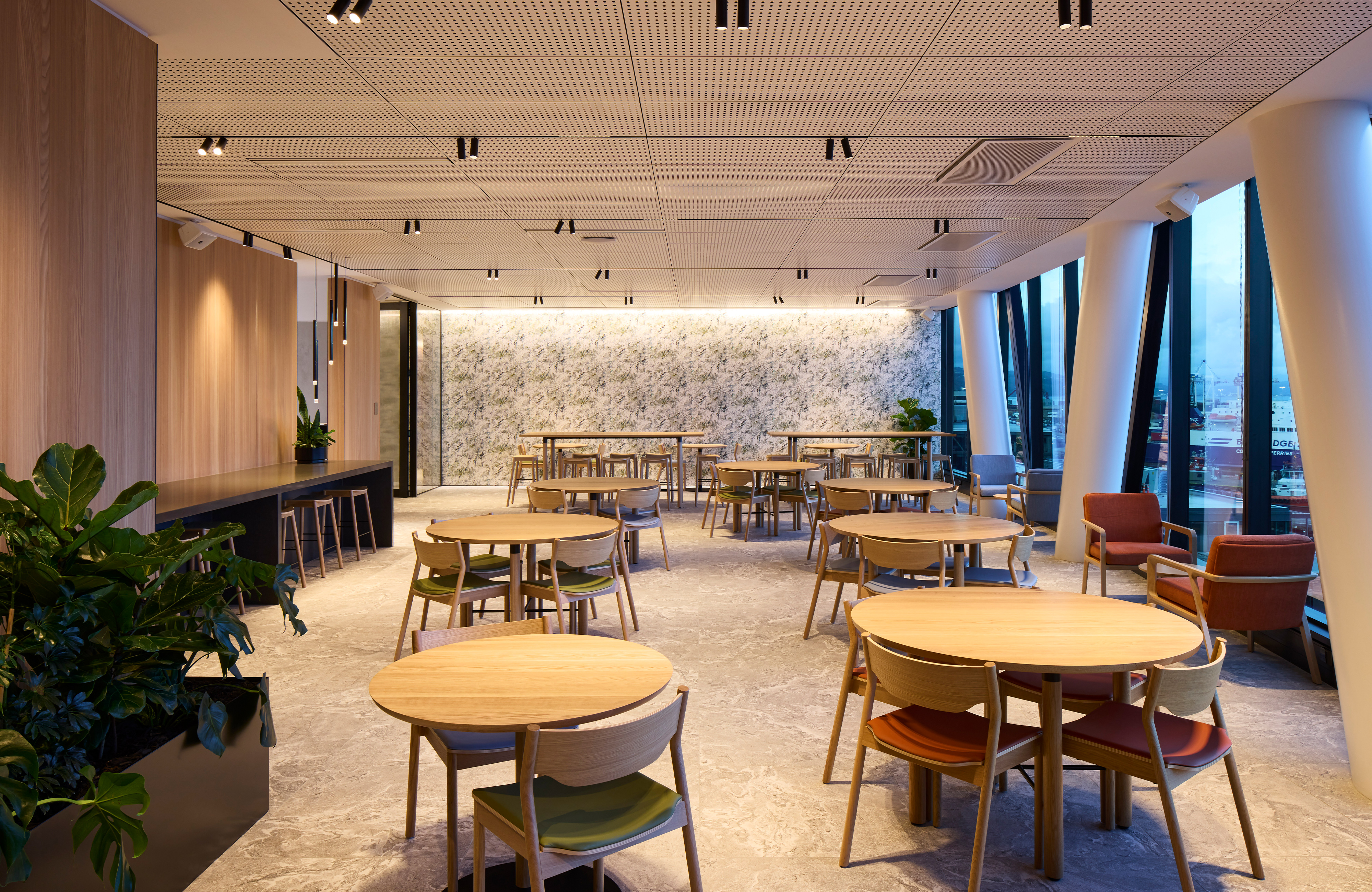 A fantastic setting over two floors in the middle of the recently completed Deloitte building on Customhouse Quay maximises views over the harbour to the eastern hills. The selection of finishes from spaces at the back to the front create a legible narrative that relates to the layered hills seen in the evening light. Advantage was taken of a hole between the two floors made during construction and the result is a triumphant open stair with a double-height wall of books – a centrepiece that links both floors. Carefully considered lighting of stair treads and books adds significant impact. Materials, furniture and lighting come together to create an environment of exceptional quality.