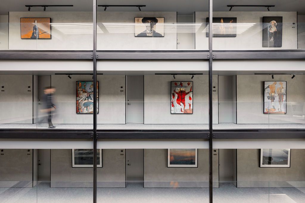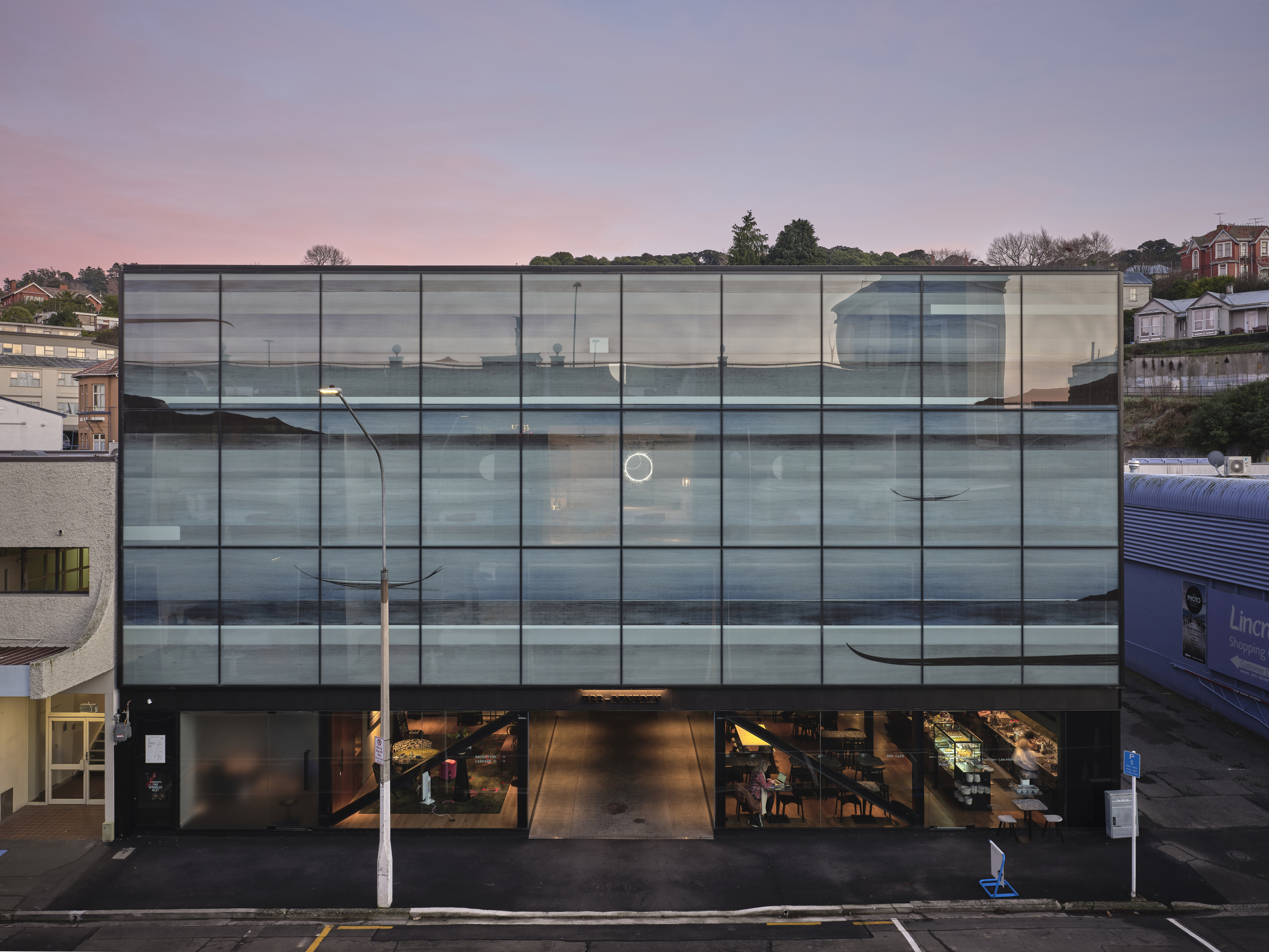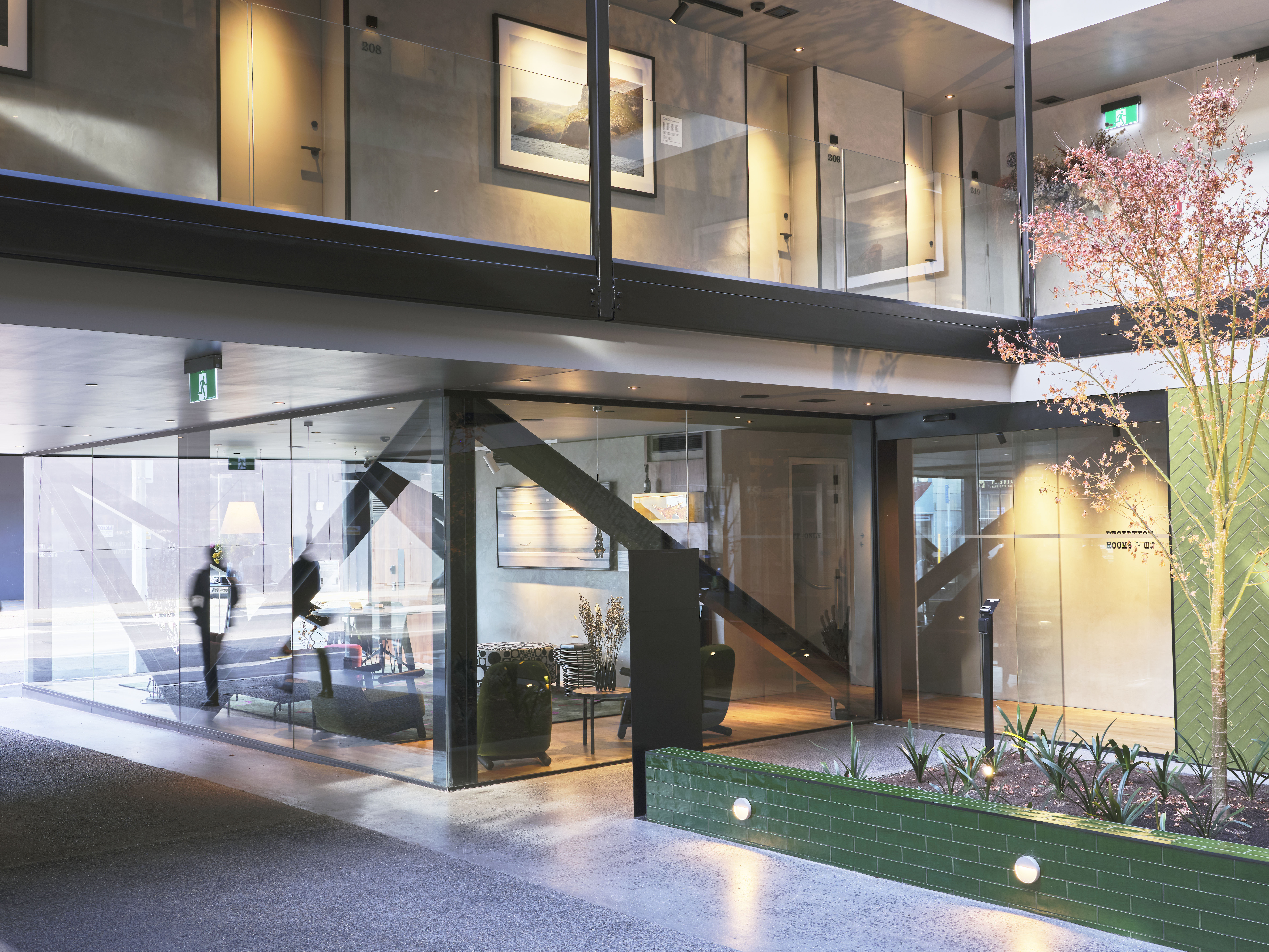 Art and architecture combine in this unique concept hotel. A bold move from the architect inverts the usual atrium and lobby areas, truly bringing the outside in and providing green spaces and copious natural light. Refined metalwork detailing, art gallery walkways and clever pockets of landscaping contribute to an undeniably special experience for guests. A creative solution for privacy sees a large-scale artwork on the glazed curtain walls transform the building into an elegant installation for downtown Dunedin.