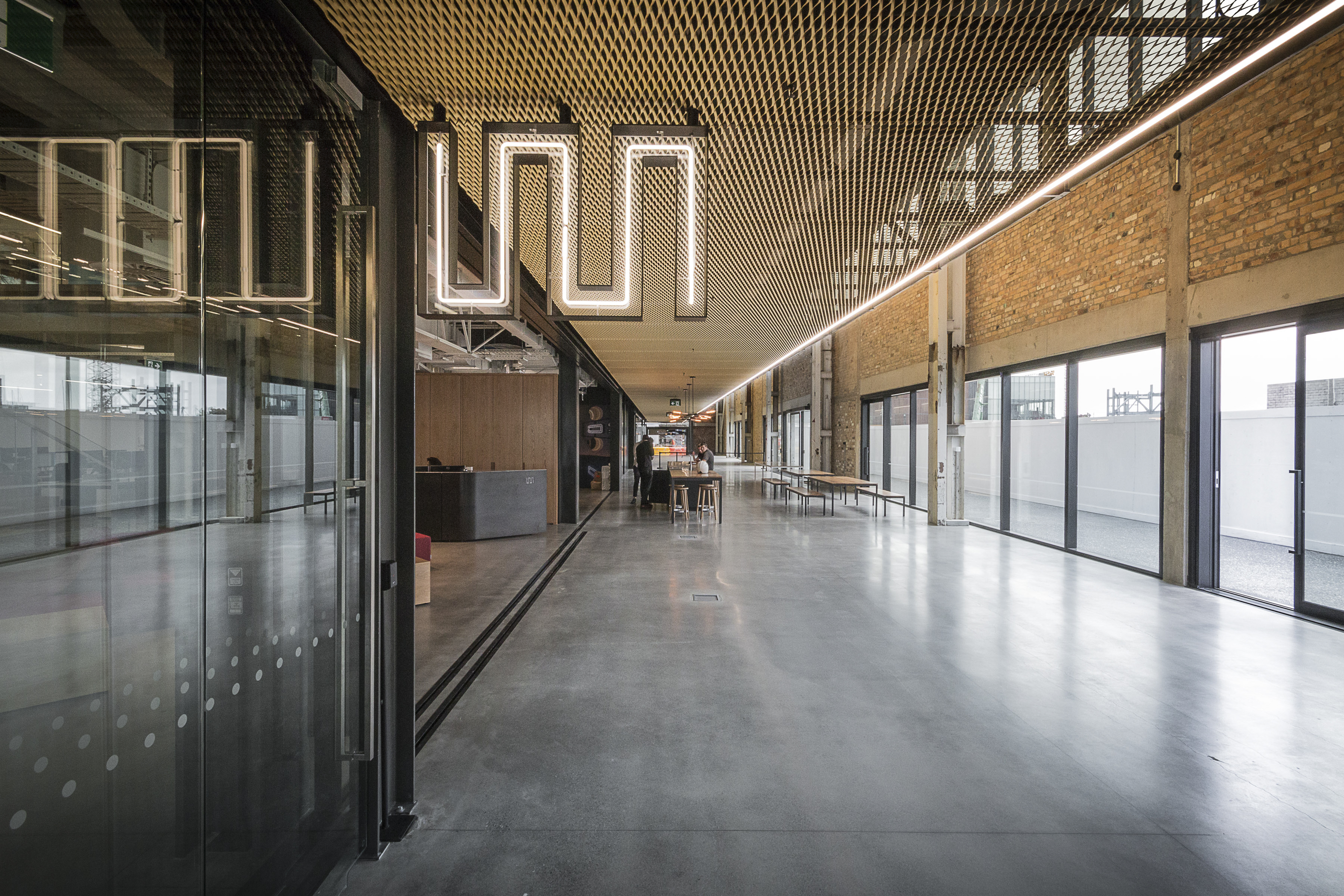 Delicate materials and proportions are combined with existing concrete and brickwork with rigour and precision, providing a sense of the precious in an industrial context. A floating gold-glass box sits over a generous public offering of an internal street alongside a laneway, reinforcing the mix of precious and urban.
