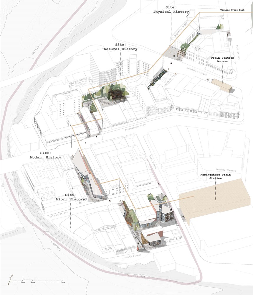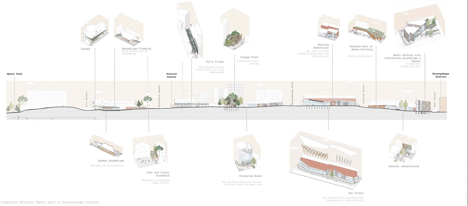 This project aims to reclaim the porosity in the urban fabric of Karangahape to create pedestrian connections through a series of architectural and urban design interventions developed in two phases. The first is creating a physical connection for pedestrians, and the second is building a cultural connection to the Karangahape area.