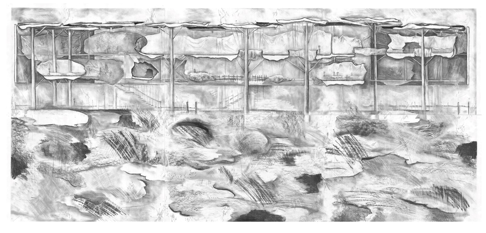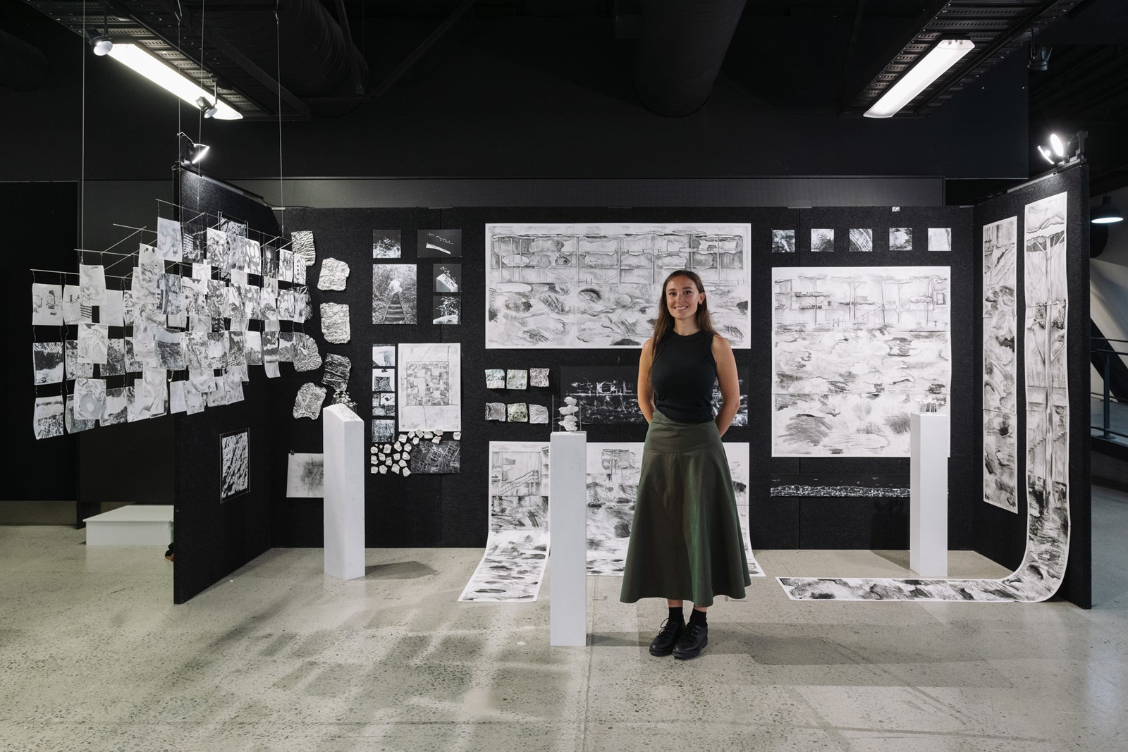 Ella perceives the abstract black-and-white architecture drawings as a collaboration between herself and the earth. Drawing is used as a medium to think through, experiment and map out the turbulent relationship with the ground, culminating in the reimagining of the Dominion Museum, a heritage commercial building. With its architectural origins rooted in the Chicago-inspired style, the building is not indigenous to place and by dissolving its solidity, gravitas is given over to the ground beneath.