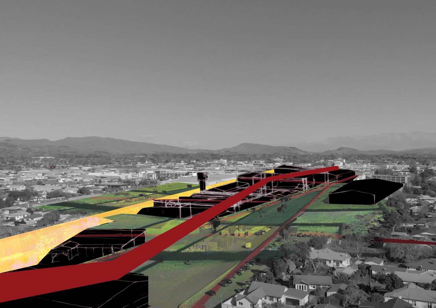 The dominating visual presence within the city is the Wattie’s factory, an industrial eyesore and an anomaly within the grid. The factory site spans a kilometre through the city centre, creating a physical impediment to the wider landscape and limiting pedestrian connections within the city. This project takes an urban architectural approach in the re-purposing of a large industrial site to revitalise a regional city. It dreams of urban possibilities to reconnect and give back to a city where height is privileged.