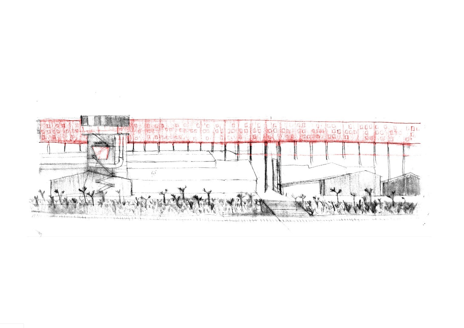 The plan considers the city of Hastings’ grid layout and how a fruit and vegetable processing plant, which spans a kilometre in length, presents an anomaly within the structured format. While this building’s scale overwhelms the grid and impedes connection, Ella’s design opens up possibilities for access.