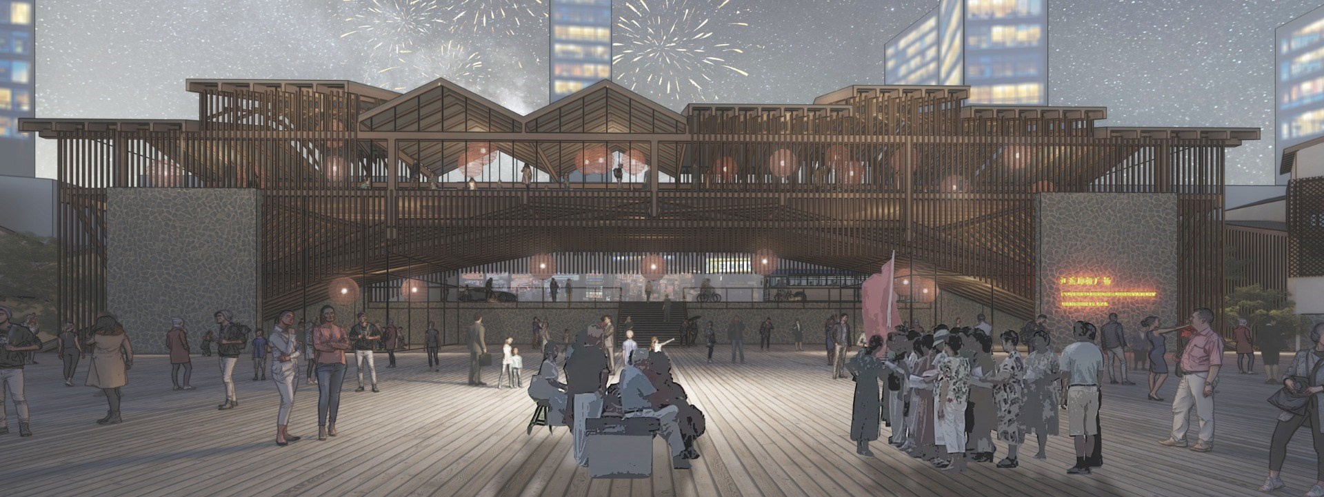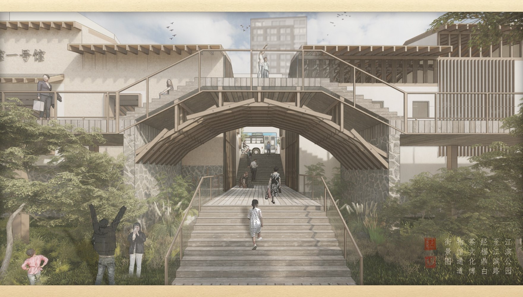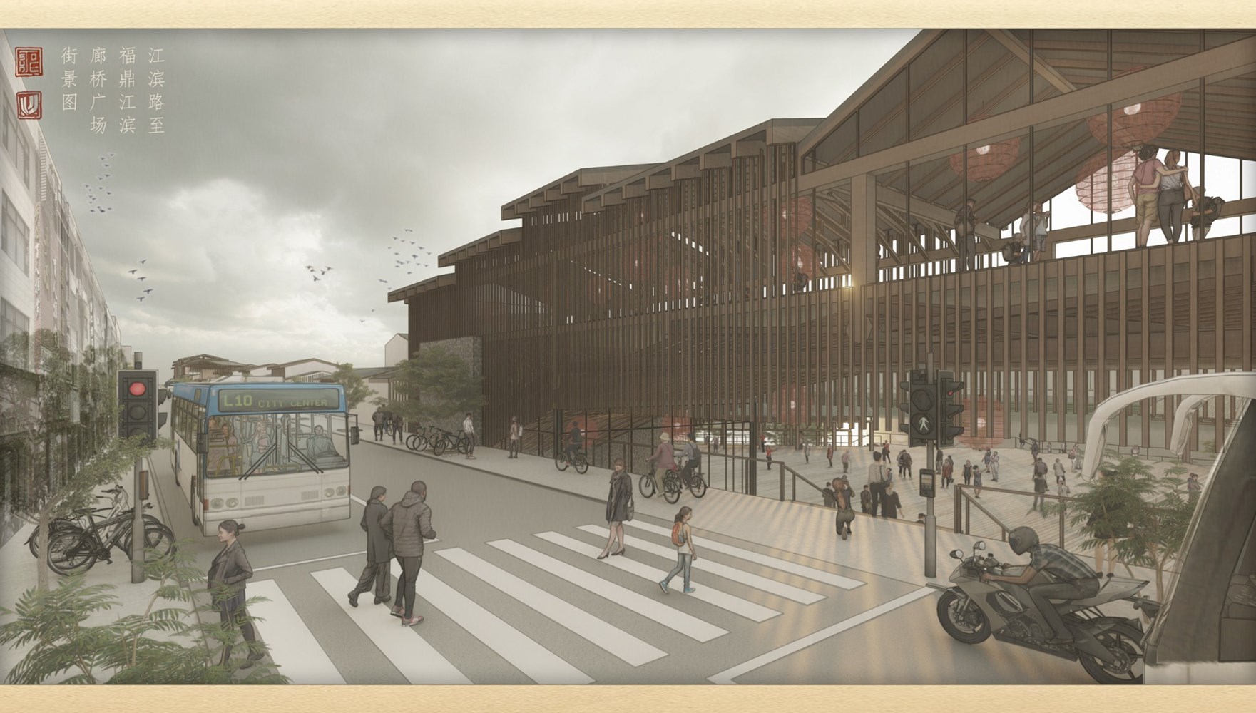 Along the River During the Qingming Festival by Zhang Zeduan is one of China’s most notable handscroll paintings and it presents a traditional Chinese city better than any real scene. This inspired me to create a new image of a Chinese city. Fuding is the small city in Fujian province where I was born, and the predominant design method undertaken to capture it was drawing – carefully reimagining traditional Fujian architecture, including the covered bridge and traditional Fujian dwelling, tulou. Through exploration of the colour palette, composition and variance of form and mass, the design idea began to respond respectfully to both traditional regionalist culture and the modern city. The result is a future vision, achieved by providing an urban architectural intervention and subsequent precedent to inspire Chinese cities and other cities around the world, in the hope of rebuilding a cultural image that we are proud of.