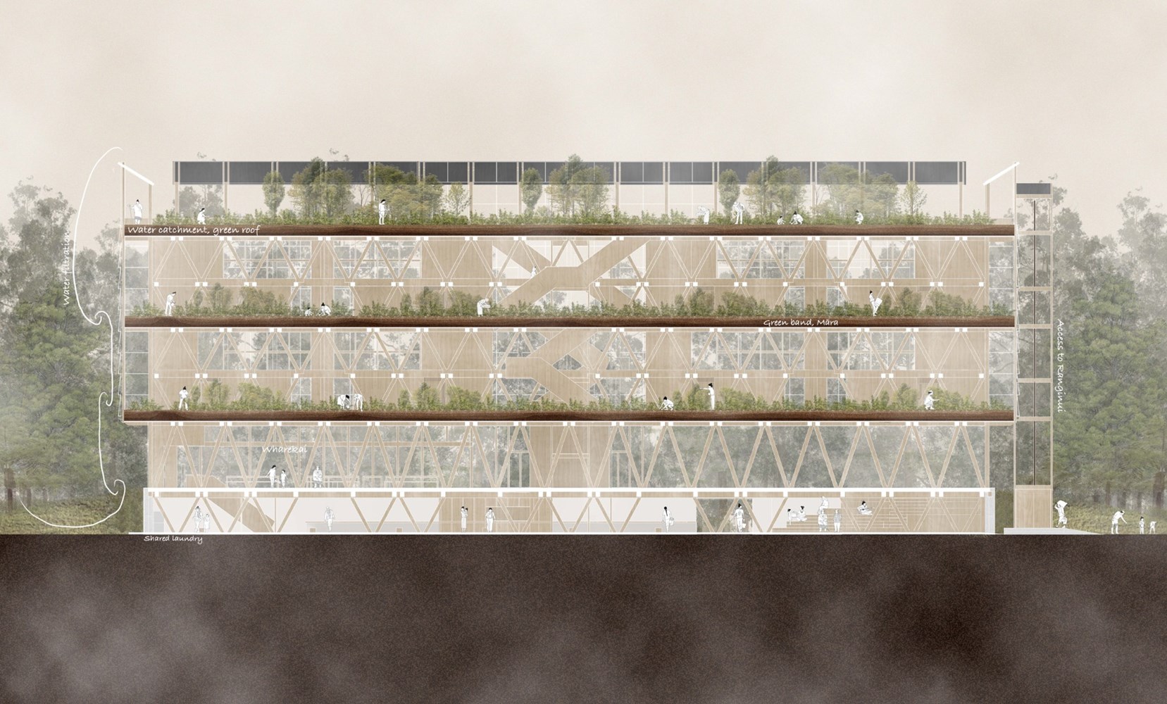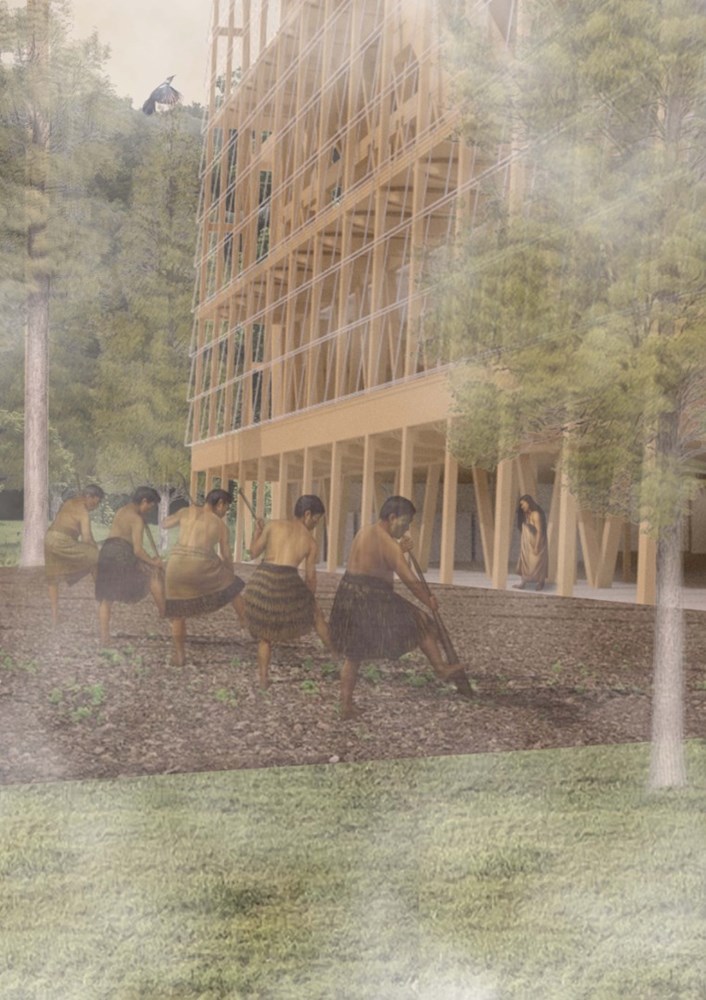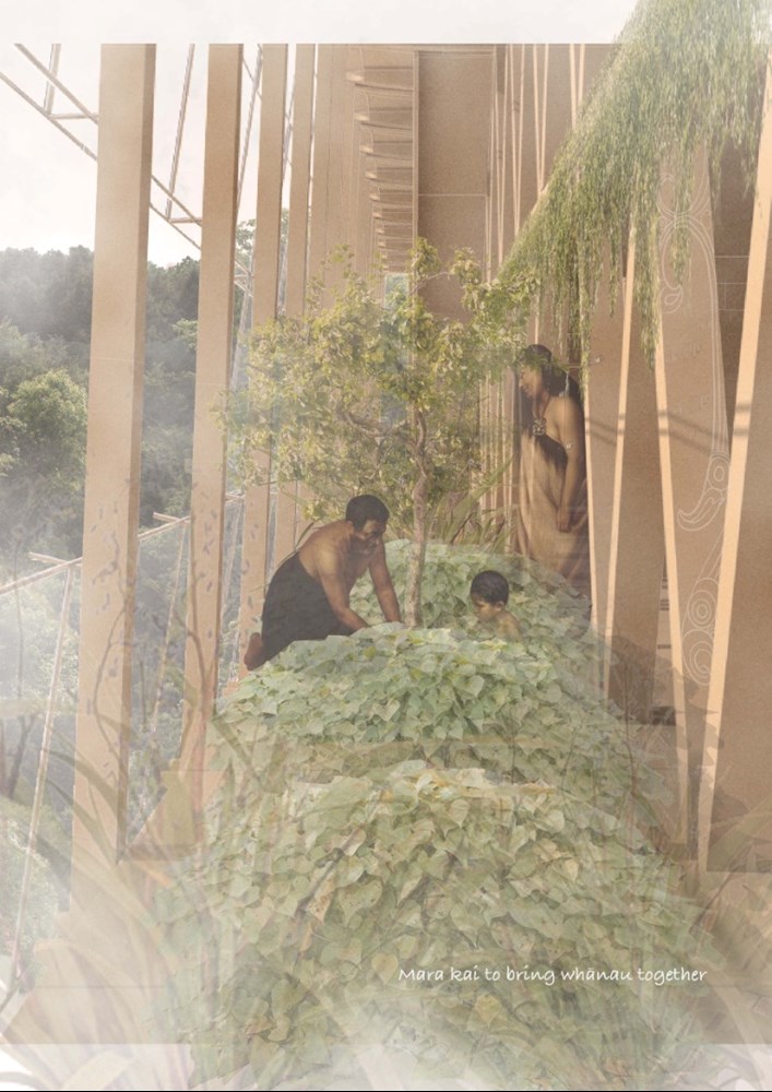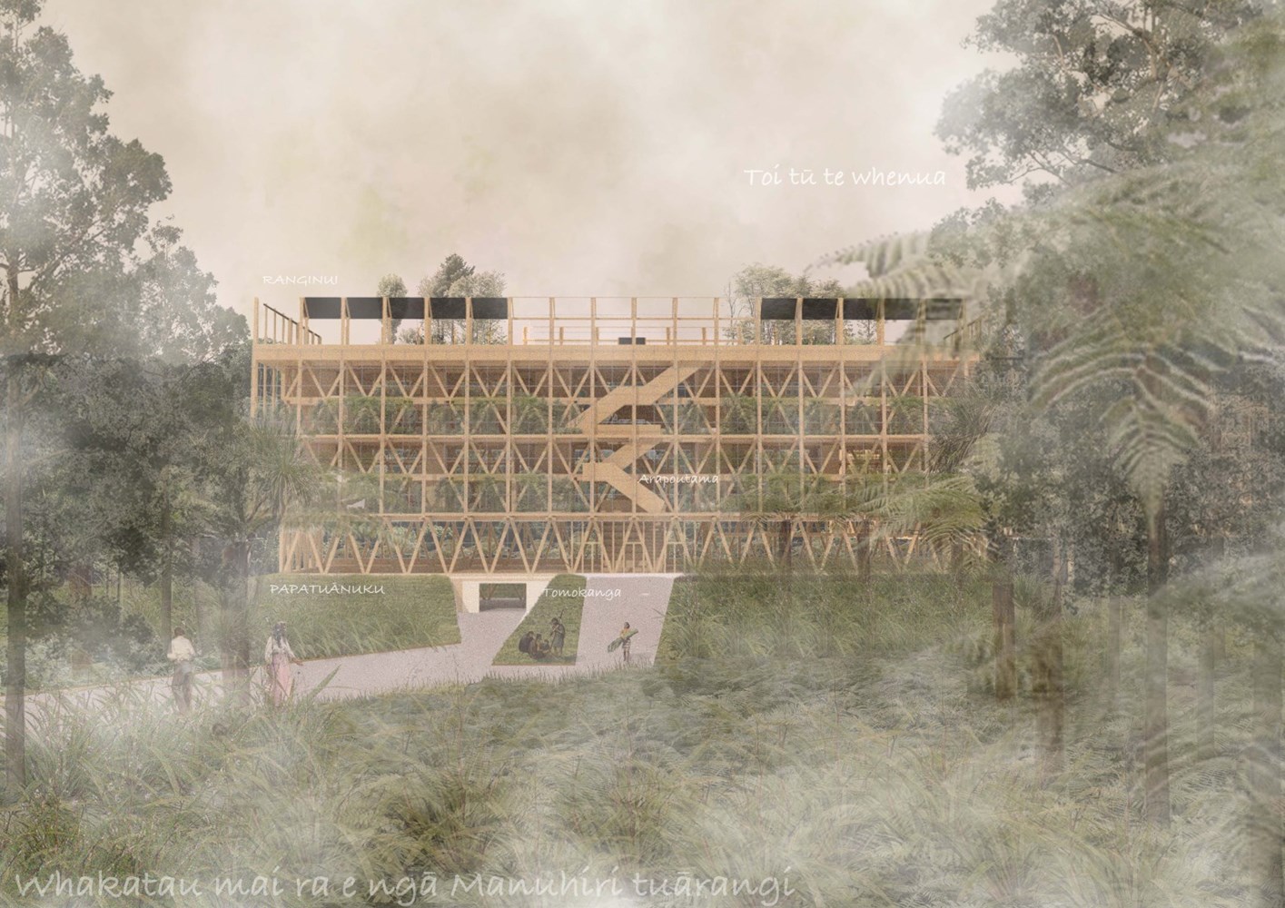 Through architecture grounded in tikanga Māori at the physical, spatial and spiritual levels, this proposition re-imagines people living in harmony with Ranginui (Sky Father) and Papatūānuku (Earth Mother). The vertical arrangement creates connection to both and recognises this space as essential for architecture to occupy. It also re-establishes star observation and celebrates Matariki.