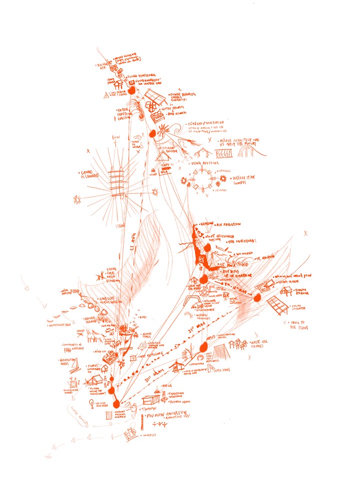 Toitū te whenua, toiora te wai, toitū te marae poses the reframing of architectural methodologies in a response to he huringa ahurangi the changing environments by foregrounding the exploration and testing of Indigenous methodologies. The study takes its critical conceptualisation from climate change, settler colonisation, and mana motuhake-inspired indigenising practices organising through orientations to te kore, te pō, and te ao mārama. The objective is to engage with the ahi ka of iwi, hapu, whānau, experts and architects alike. This is facilitated by the practice of indigenised methods such as whakapapa plotting and mahi toi as representational and expressive techniques of speculative design.