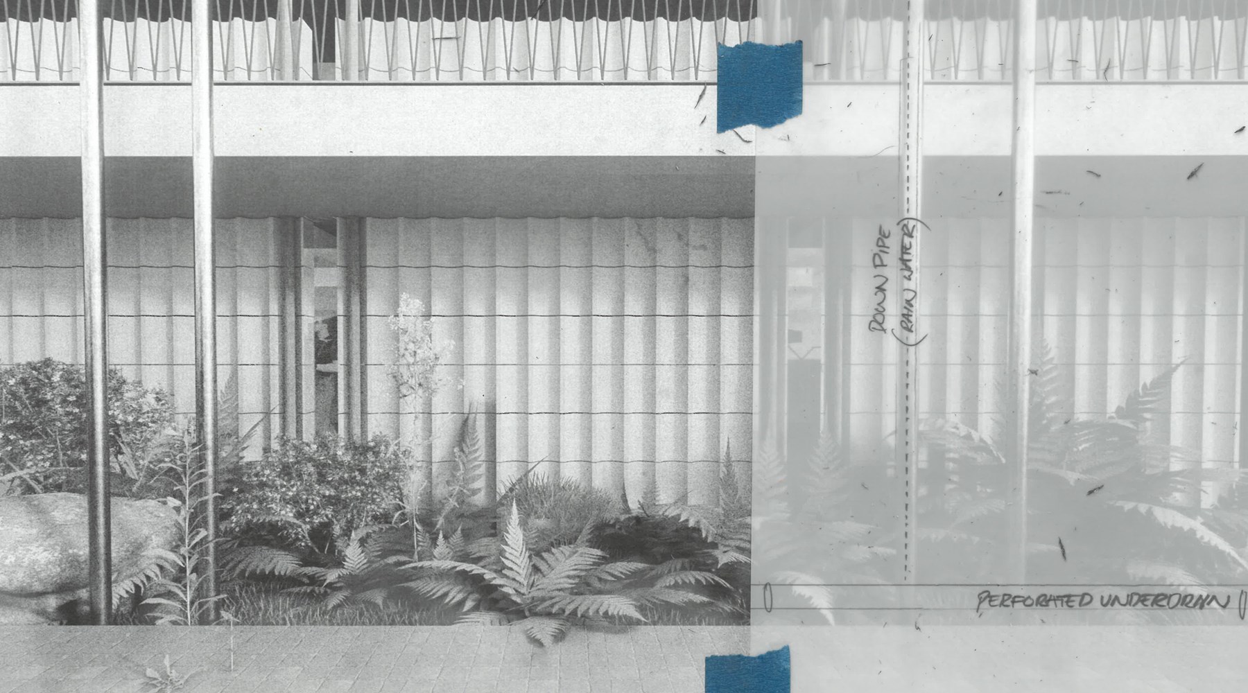 The rescripted building consolidates a therapeutic complex – ‘Fringe House’. The titular ‘Fringe’ is positioned firstly through Titirangi’s translation – ‘Fringe of Heaven’ – and secondly through its peripheral occupation at the city’s edge. The complex is triadic: ‘The Terrace’ – a meeting place and kitchen; ‘The Cabins’ – therapy spaces; and lastly, ‘The Makerspace’. These typologies leverage Titirangi's natural landscape, bohemian community and art culture, set to amplify emotional wellness and signalling the architecture’s kinship to place. Design motives arise from local architecture that fosters sincere reconciliation with its landscape. Accordingly, the structure is set back to foreground Indigenous bush, stormwater systems embrace Titirangi’s rainfall, and transparency maximises views and blurs a sense of inside-ness/outside-ness.