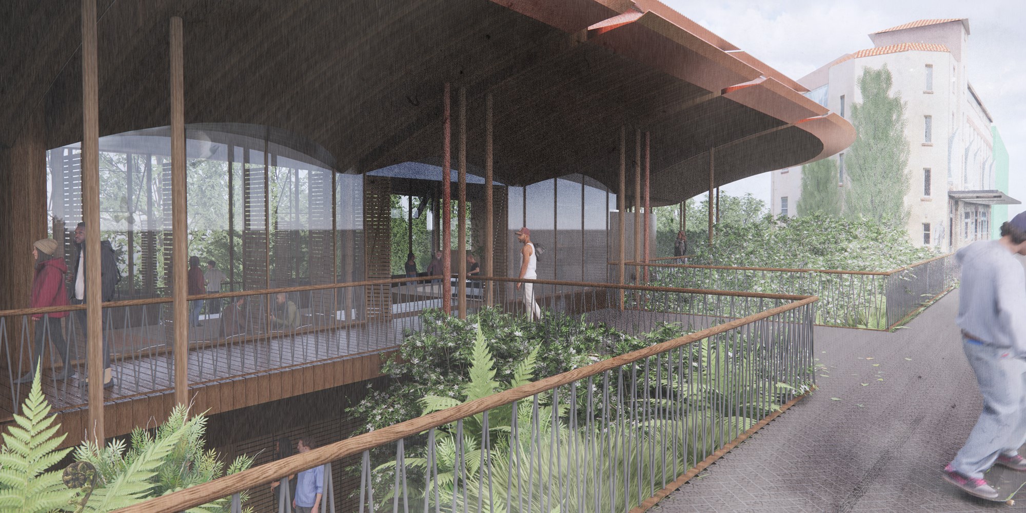 This project stems from the suspicion that feelings of dis-belonging and identity loss coincide with alien architecture and globalisation. Indeed, the necessity for construction coincides with Aotearoa’s population growth – this work does not resist this demand. However, it does aspire to dismantle preconceptions of sprawl, instead suggesting that it can manifest without withering people’s tacit understanding of their homescape. As the Waitākere Ranges are the geographic spine of Tāmaki Makaurau, the landscape’s value manifests in the sentiment people share with its wilderness – forged through years of ancestral lineage. This project, therefore, offers an imaginative rescripting of a commercial building: what if this structure was designed through a place-privileging lens?