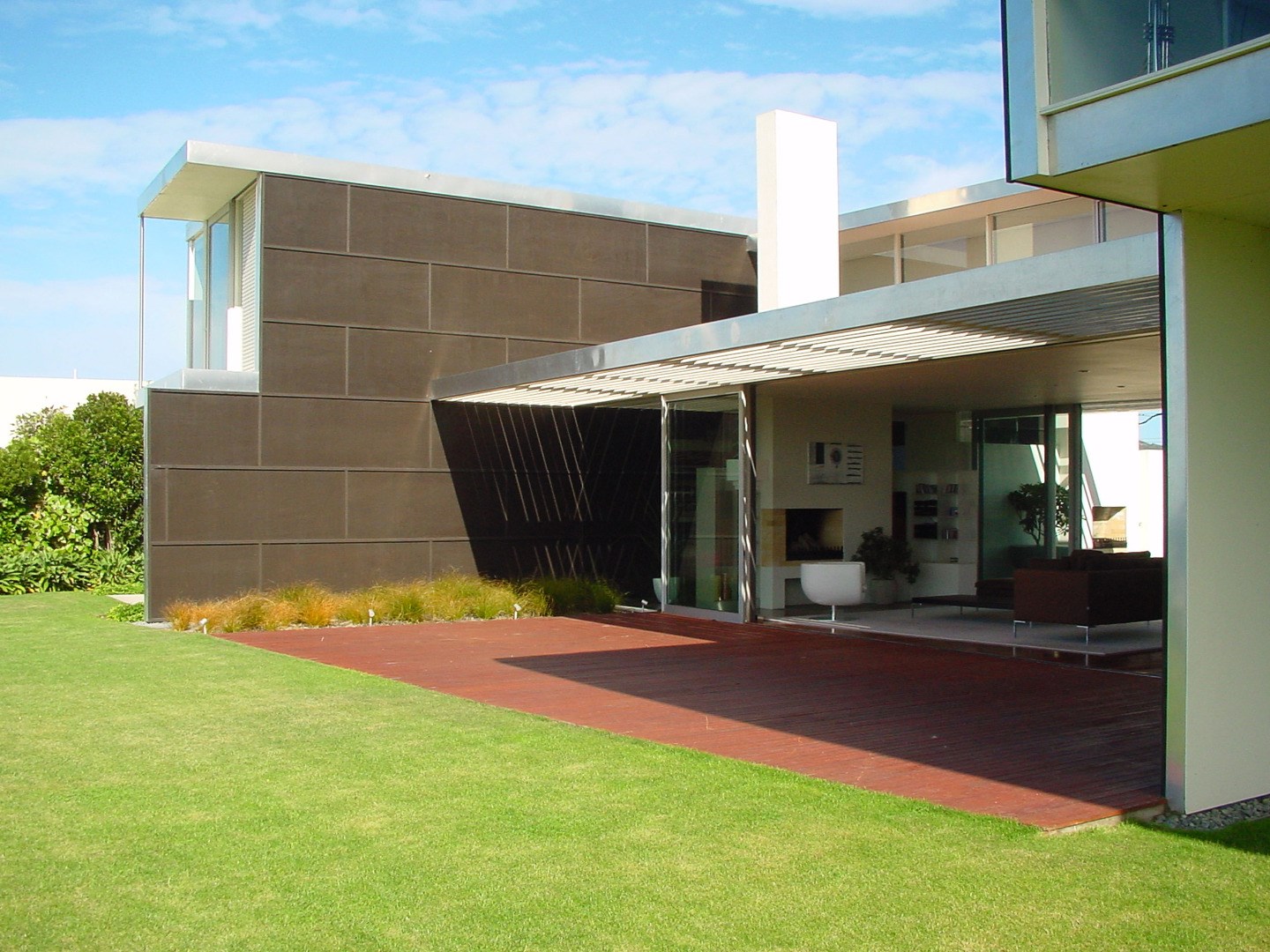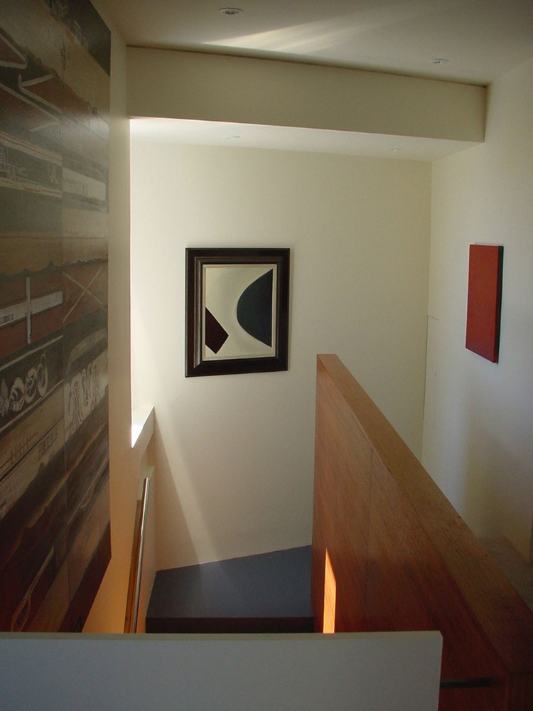 This house references a modernist revival idiom, tending to favour the wall over the roof, promoting planar surface over structural articulation and emphasising spatial continuity with the exterior. The eye focuses on a seamlessness in the detail. The planar surfaces and the flush detailing are not merely self-referential, but are put to work in underscoring the constructed spatial drama of the ridge top site. The house’s neo-modernist glass box is book-ended by two apartments that in their planning offer both occupancy choices and a retreat from the infinite space of a glazed core.
