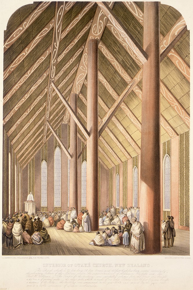 Since European contact Maori have continued to follow their own construction trajectory, responding to the imported architecture of the Christian church by building meeting houses based on churches. Church and whare, both large spaces for gatherings of people, share purpose and form, a congruence famously expressed in Rangiatea [Otaki, 1851], usually described as a Maori church.[12] The canonical form of the meeting house was established by Te Kooti Arikirangi Te Turuki, who renovated Te Tokanganui-a-noho in 1885. This single space building, with one door and one window opening onto a sheltering porch and a backbone ridge supported on ridge posts, was the model for what has become the traditional form for the meeting house.