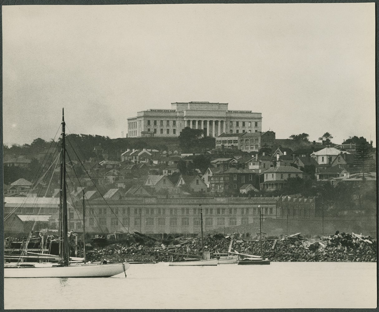 The Pacific Ocean accounts for one third of the surface area of the Earth. It is vast and seemingly empty, although of course it has inhabitants, many of whom view the Pacific as ‘a sea of islands’. The last Pacific islands to be settled were rediscovered in 1769 by the English navigator, James Cook. These islands, named ‘New Zealand’, were inhabited by Maori who had themselves settled in the land they called ‘Aotearoa’ several centuries previously, having sailed from the centre of the Pacific, which their ancestors had populated over several millennia, by island-hopping from the Far East. The early European explorers appreciated the skills and craft that achieved these journeys and they also admired the architecture they encountered. Cook had on board his ship a Polynesian from Ra’iatea in the Society Islands, Tupaia, who was able to communicate with Maori. As Tupaia’s drawing [see gallery] of a Maori presenting a crayfish to a British naval officer indicates, Europeans initially relied on Maori for food and shelter. The settlers soon forgot about this early vulnerability and set about establishing their own way of life and architecture on this far-flung frontier of the British empire. When, in the 1890s, Rudyard Kipling described Auckland as “last, loneliest, loveliest, exquisite, apart”,[1] he was not, we assume, referring to the settlement’s colonial architecture, but rather to its volcanic and watery landscape.
