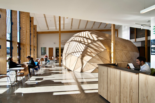 Tertiary campuses are important sites for the development and expression of contemporary Māori architecture, in keeping with their role in maintaining mātauranga Māori. Tennent Brown’s long-term relationship with Te Wānanga o Raukawa in Ōtaki has produced a series of notable buildings that continue the practice’s focus on co-design, tikanga and kaitiakitanga values. For Māori, new architecture is never without precedent. For Tennent Brown and Te Wānanga o Raukawa’s 2012 Ngā Purapura sports and lifestyle learning centre, that precedent was Rangiātea. Rangiātea is remembered by some iwi as the central Pacific departure point for Polynesian ancestors migrating to Aotearoa; it is a place of origin remembered in the whakataukī (proverb) ‘E kore au e ngaro he kākano i ruia mai i Rangiātea’ (‘I shall never be lost, I am a seed sown from Rangiātea’). Ngā Purapura’s design acknowledges the whakataukī through the inclusion of a multifaceted timber kākano (seed) pod for nohopuku (reflection). Tennent Brown, working closely with kaumātua and senior academics including Meihana Durie, used ‘Te Whare Tapa Whā’ (‘The Four Sides of a House’) hauora (wellbeing) model as the design basis for the four rooflines above the section of the building adjacent to the sports hall. Ngā Purapura, the name of the complex, recalls the famous, star-like purapura whetū tukutuku (stitched wall panels) in the nearby Rangiātea Church.