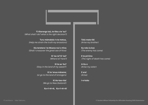 Improving the wellbeing of Cook Island Māori through the built form is the topic of interest for a collective composed of David Raea, David Simiona, Tony Laiman and Joanna Jack. Focussing on a site in Māngere, Tāmaki Makaurau Auckland, the group proposes to use cultural symposiums and workshops to develop culturally specific design principles to apply to affordable housing masterplans and modelling on the site.